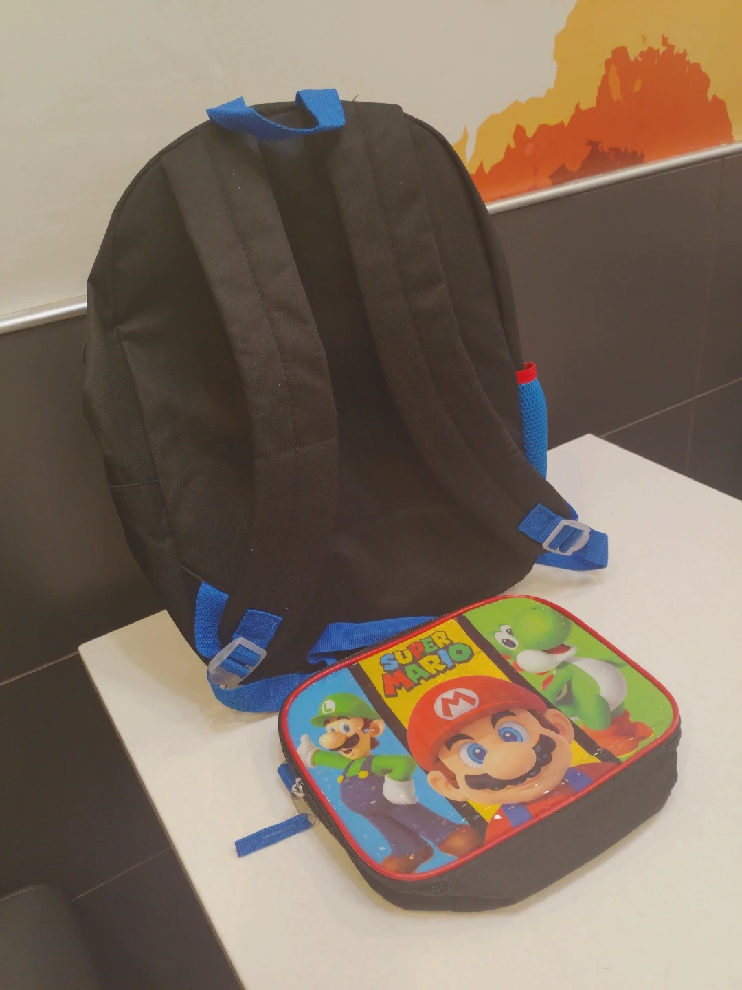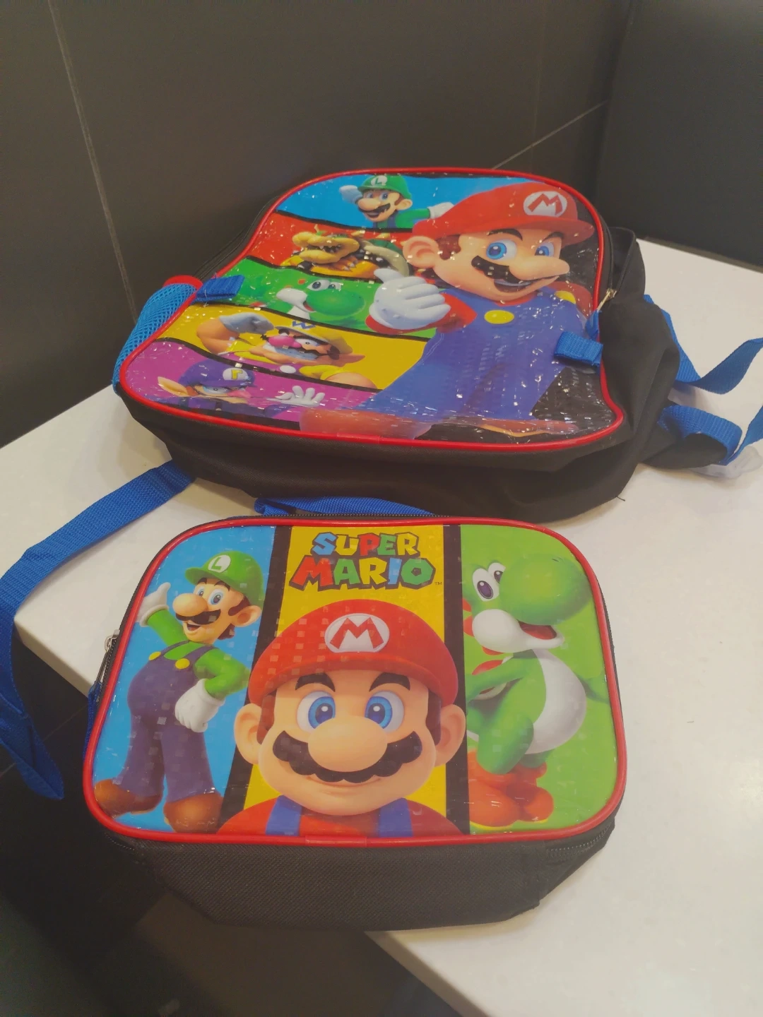 This is a Super Mario themed backpack and lunch box set. It features colorful graphics of Mario, Luigi, and Yoshi. Perfect for school or carrying essentials!