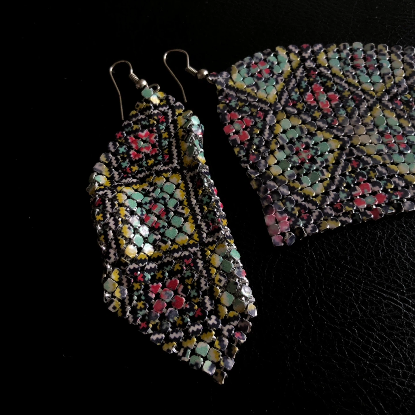 These eye-catching earrings feature a mesh construction with a vibrant, geometric pattern of colorful floral motifs. They have a drop earring style with a hook closure. The metal mesh offers a unique texture and flexibility.