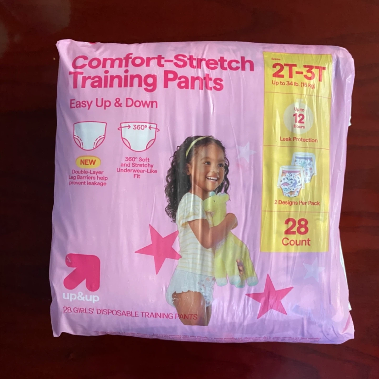 131Up & Up Comfort-Stretch Training Pants for girls, size 2T-3T. The package contains 28 disposable training pants with 2 designs per pack. They feature double-layer leg barriers to help prevent leakage and provide up to 12 hours of leak protection. These pants are designed for easy up and down and have a 360° soft and stretchy underwear-like fit.