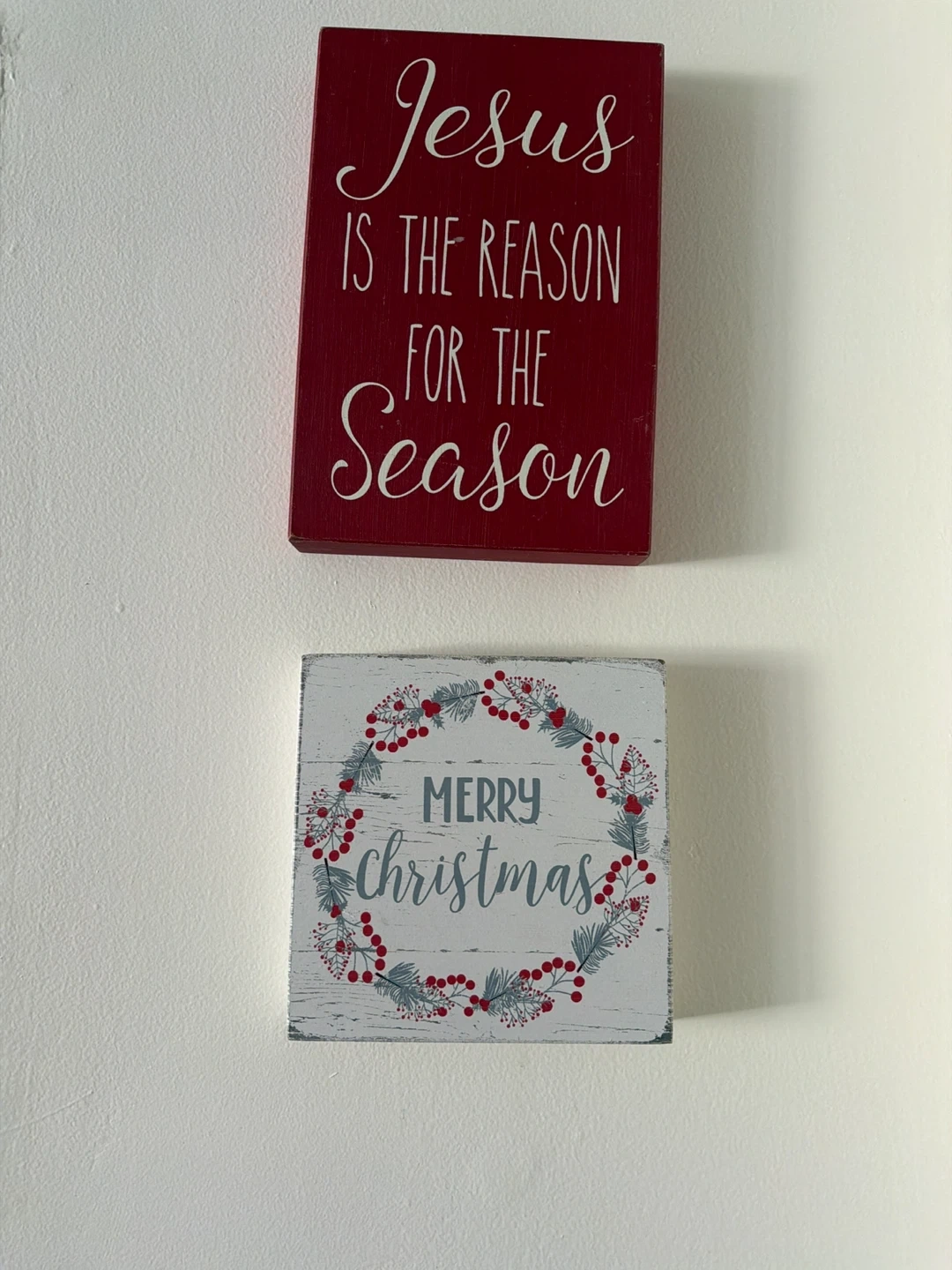 Includes one red plaque reading 'Jesus is the reason for the season' and one white distressed plaque with a 'Merry Christmas' wreath design. Perfect for holiday home decor!