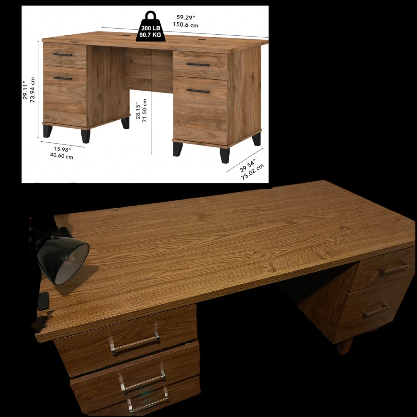 - Sturdy wooden desk with drawers, featuring a light brown wood grain finish and sleek silver drawer pulls.
