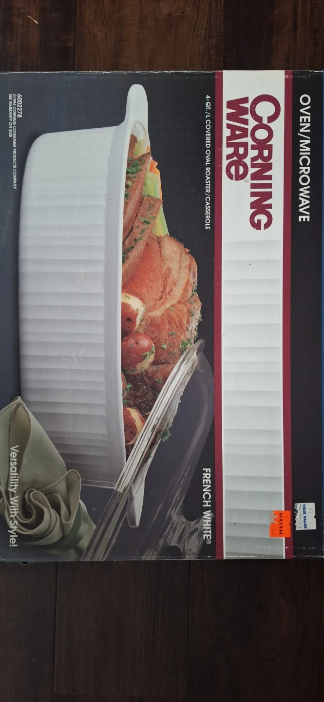 Corning Ware French White 4-quart oval roaster with cover. This dish is oven and microwave safe. It's part of the original line of Corning Ware. Perfect for roasts or casseroles!