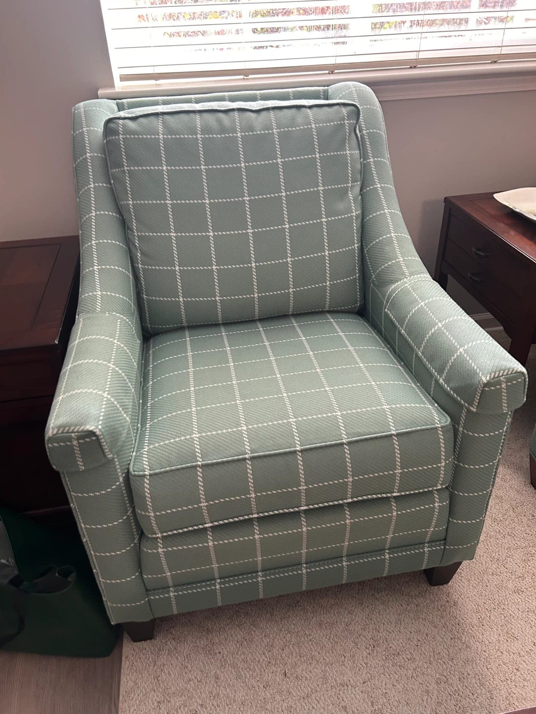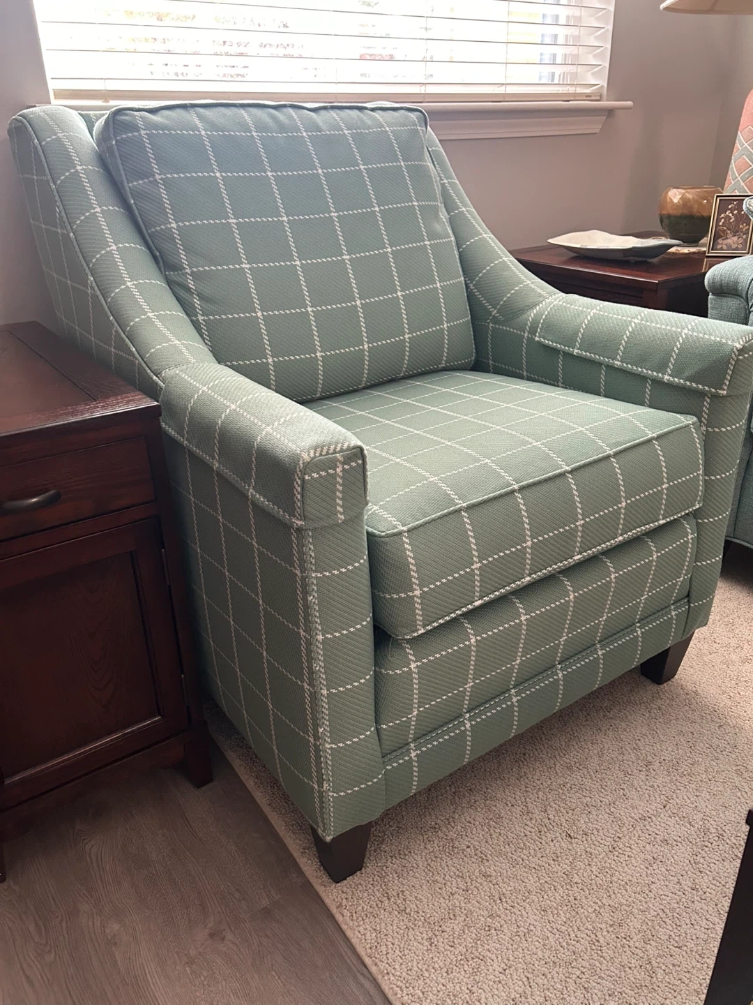 15I'm selling a comfortable upholstered armchair. It has a light green and white plaid pattern. The dimensions are approximately 31 inches wide, 37 inches high, and 37.5 inches deep. Great condition! Selling one chair because there wasn’t room for both chairs in new place. Pickup in Palatine Wrapped in plastic by movers Cash(no higher than twenties) or Venmo Whoever can pickup the quickest Cross posted