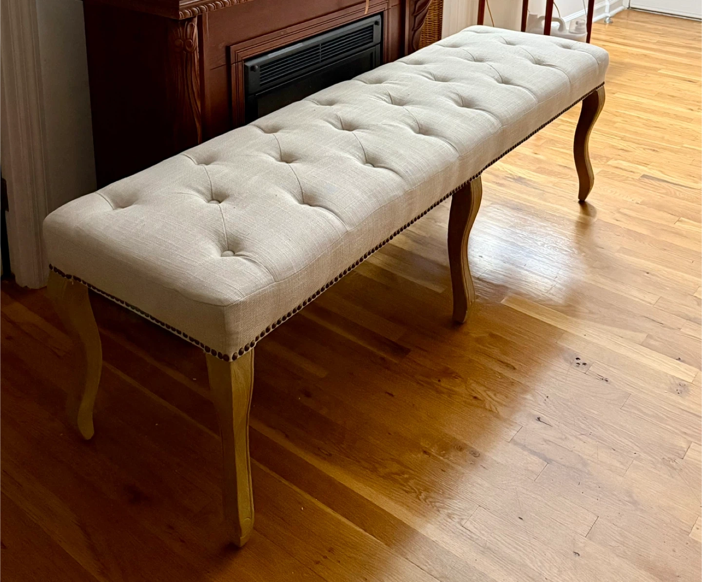 107Selling a stylish upholstered bench! It features a neutral-colored fabric with button-tufted detailing and elegant cabriole legs. It would be a great addition to any entryway, living room, or bedroom