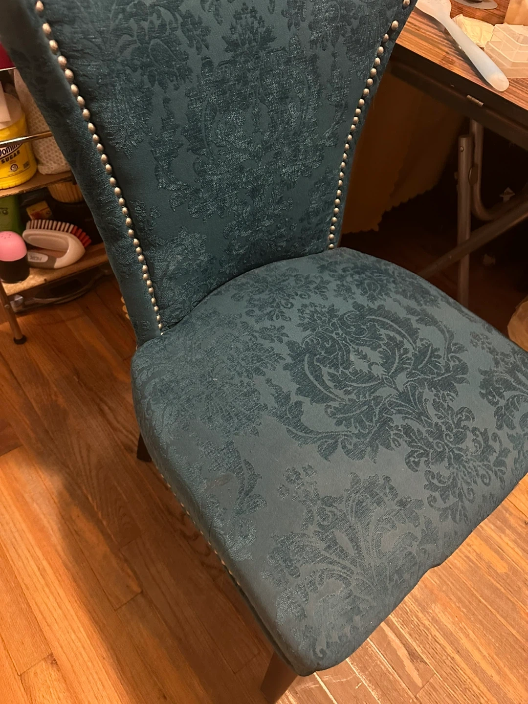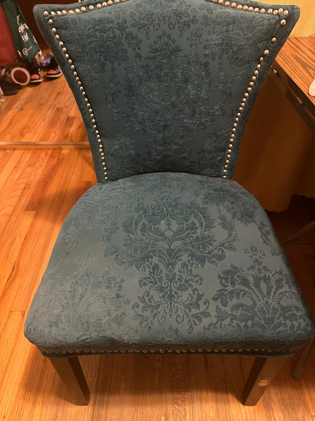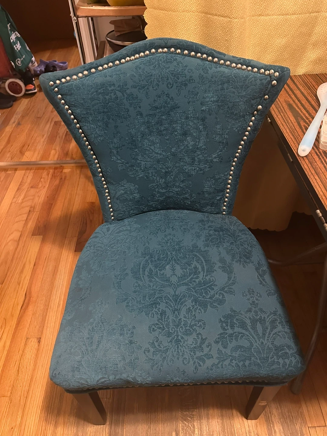 91Selling a lovely upholstered dining chair in a teal color. It features a decorative damask pattern and studded trim. This chair would be a great addition to any dining room or as an accent piece!