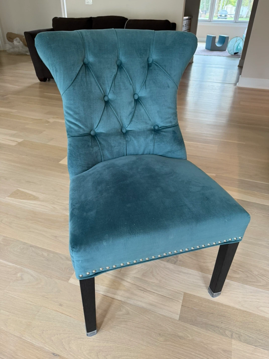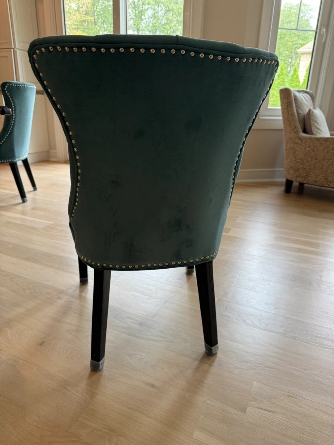 10Selling 6 Arhaus dining chairs. It features button-tufted detailing on the back and silver nailhead trim around the seat. The legs are dark wood. It's in great condition and would be a stylish addition to any dining room! $200 each