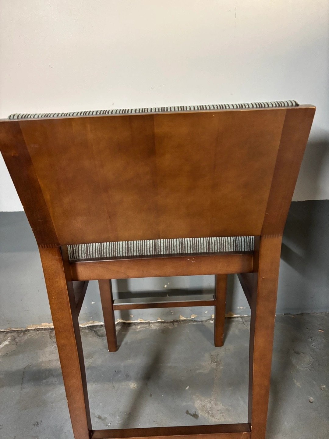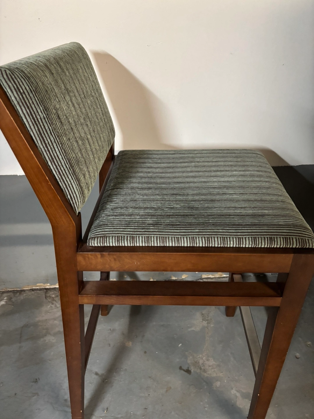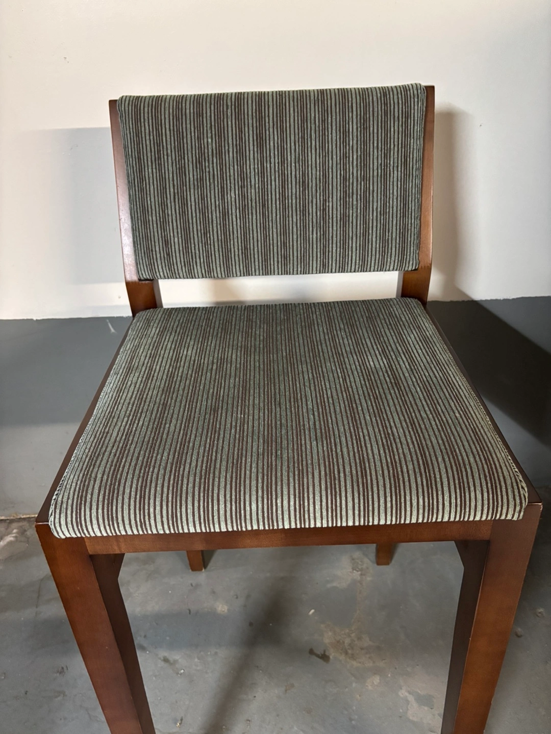 Here's a sturdy wooden dining chair with an upholstered seat and back. It has a classic design that would fit well in many dining rooms or kitchens. The upholstery is a striped pattern in shades of green and brown.