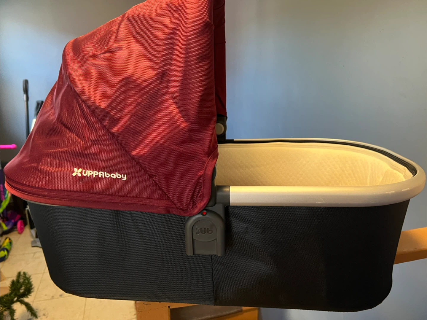 60Selling an UPPAbaby bassinet in great condition! It features a red canopy and a black base. Perfect for newborns and infants, providing a cozy and safe sleeping space