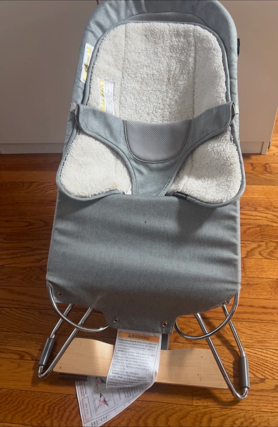 73Used UPPAbaby Mira Bouncer/Portable 2-in-1 Bouncer + Seat Grows with Your Baby/GREENGuard® Gold, JPMA + FSC® Certified/Cozy Seat Liner + Storage Bag Included/Stella (Grey Mélange/Silver Chrome/Maple Wood)