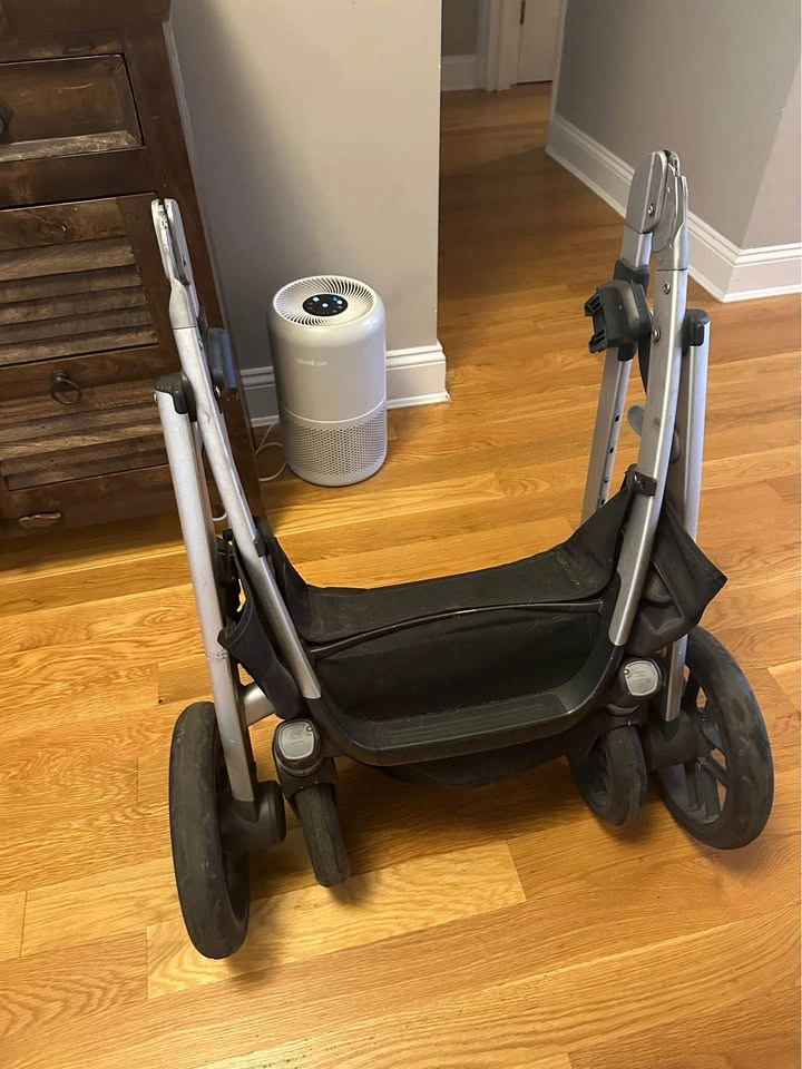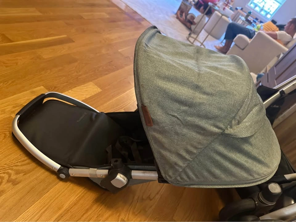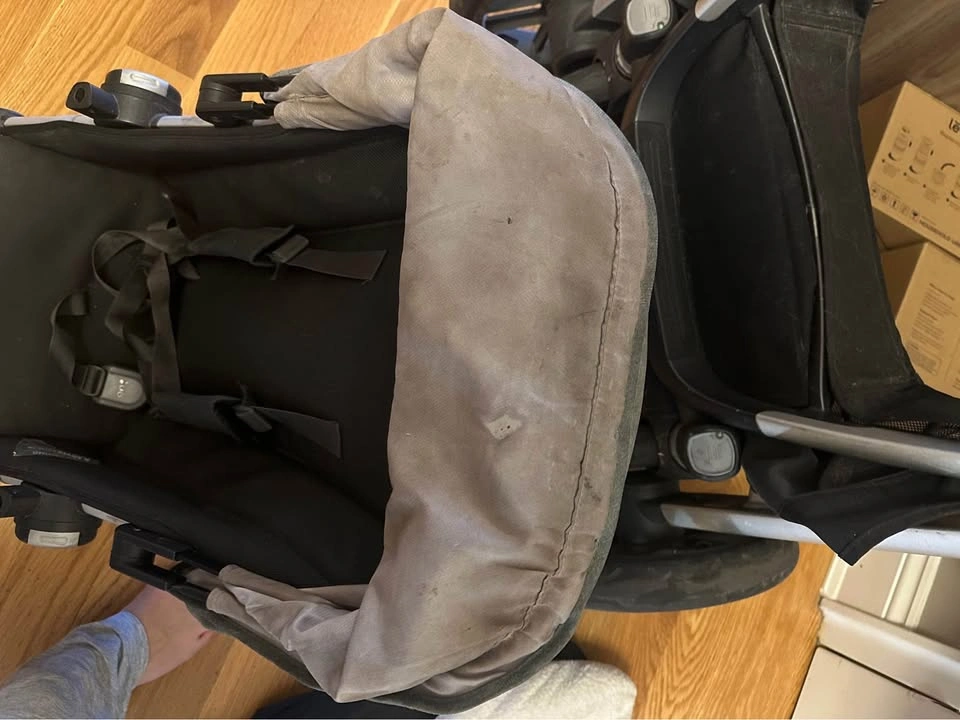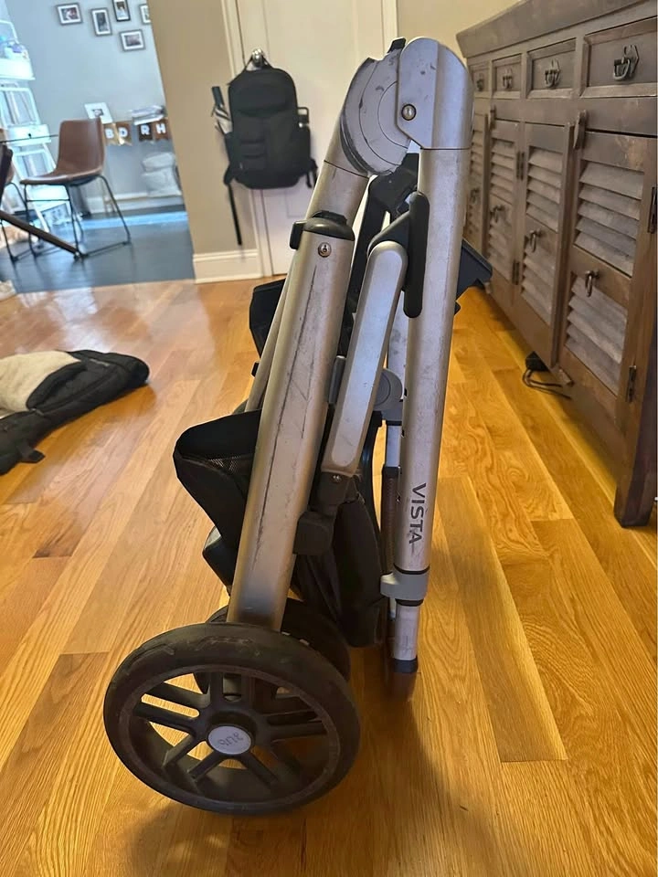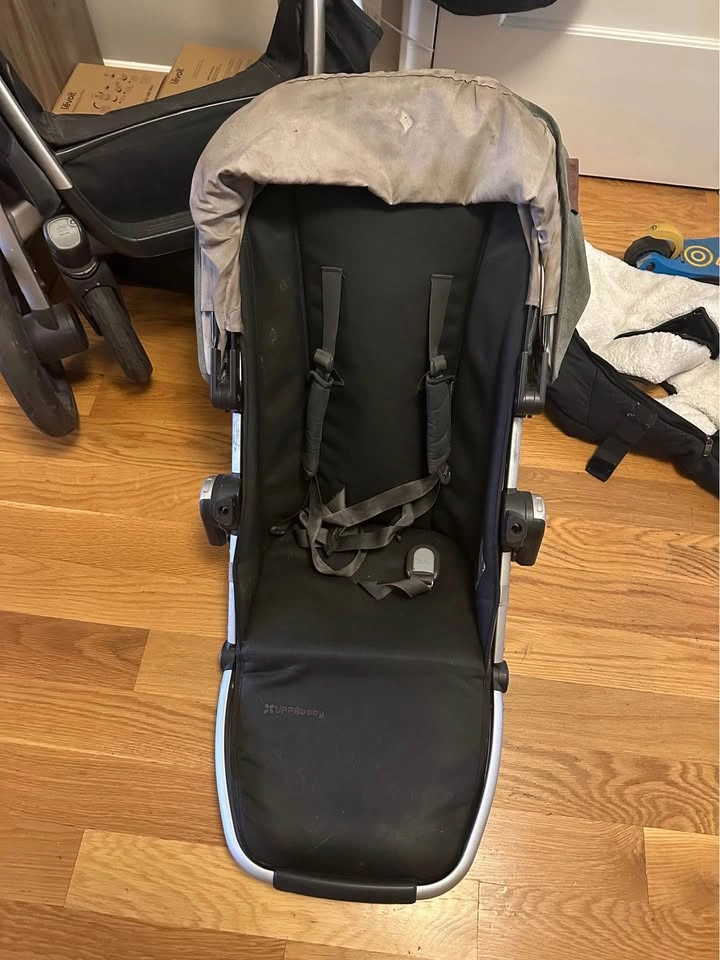 Uppababy vista stroller that has been with us for 3.5 years. We love it, we just don’t have use for it now that our child is bigger! The fabric on the hood of the chair is stained but everything works perfectly! The frame has some signs of wear/use but none of the marks affect the functionality! We also have the cozy ganoosh that can be added in if interested! Bought in 2022