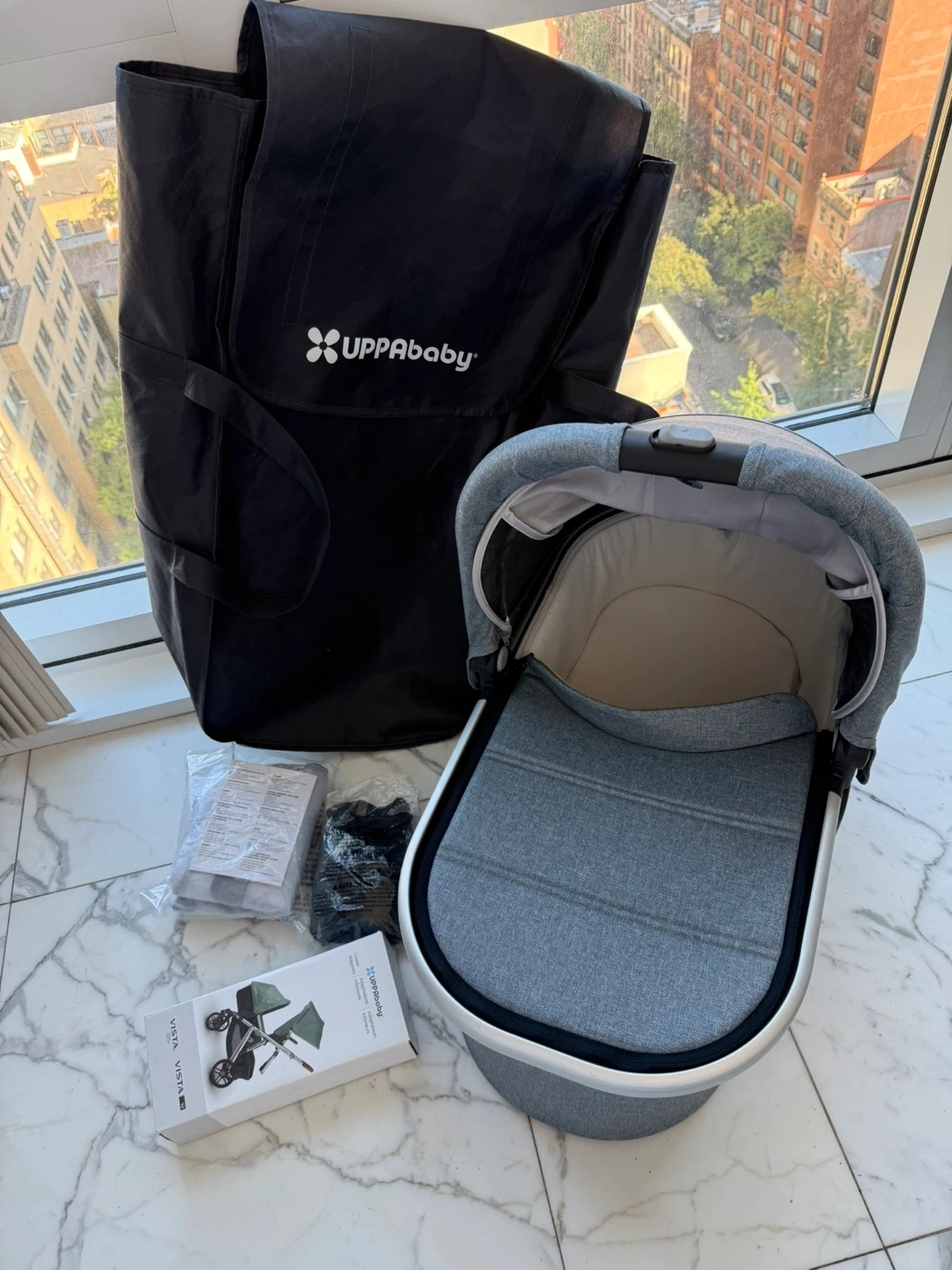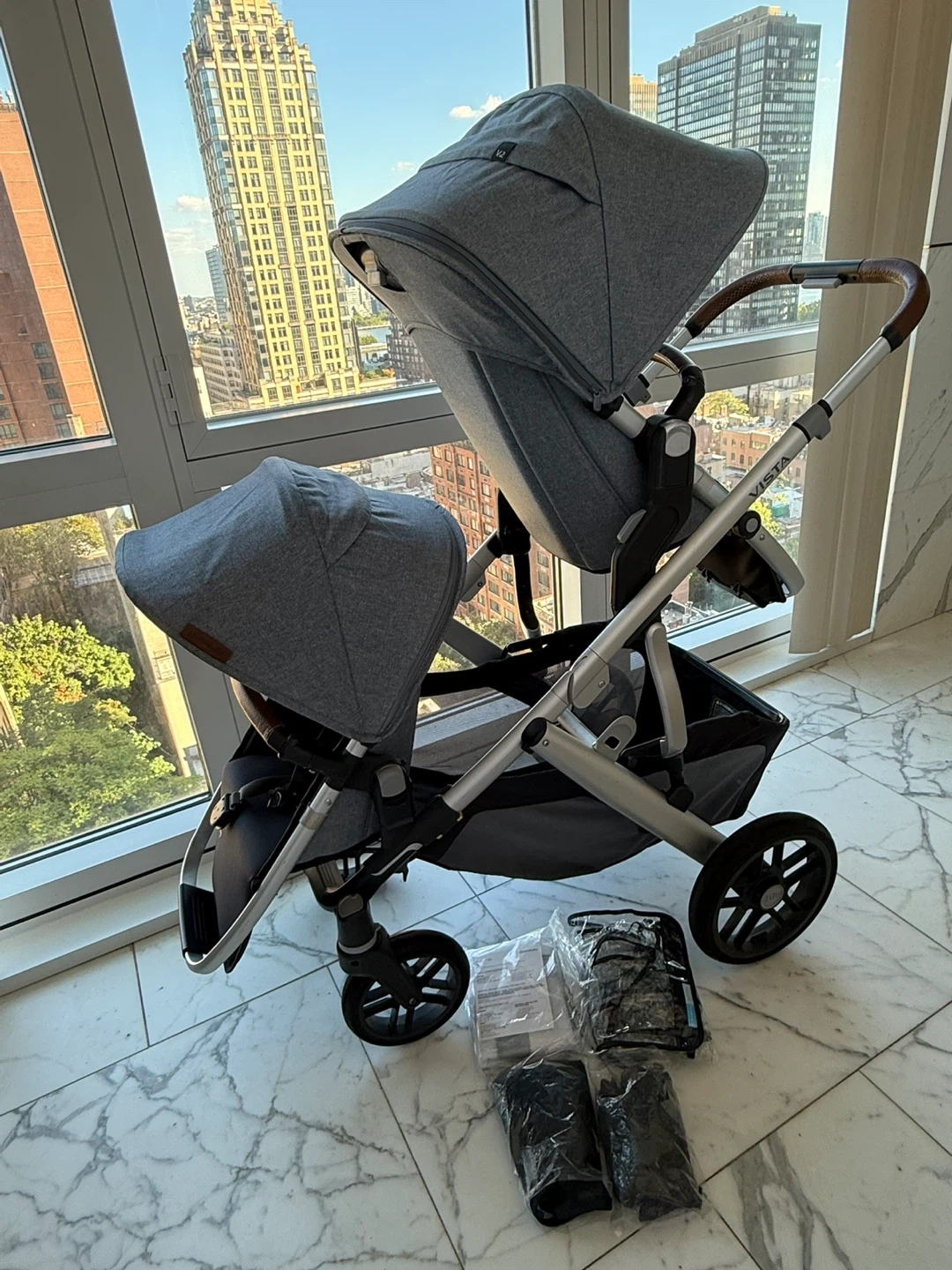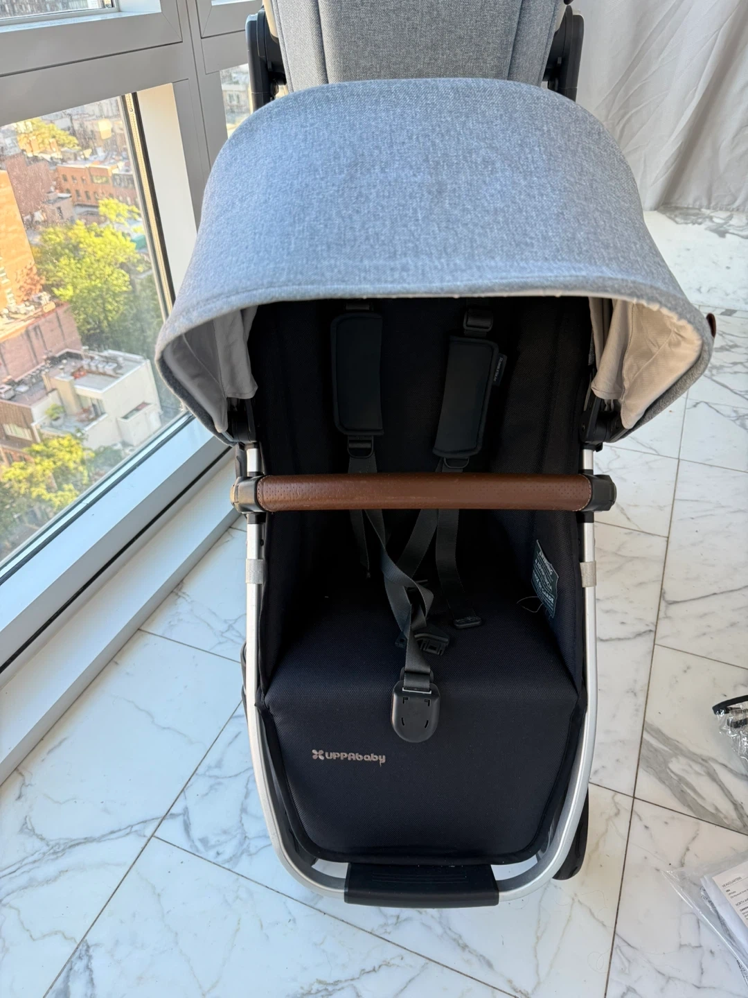 Selling our UPPAbaby Vista V2 stroller in perfect condition! (Lightly used and well taken care of) This stroller is known for its versatility and smooth ride. Comes with multiple configurations for different ages and stages. Comes with: Stroller with tow seats and bassinet(Gregory/bleu melange color), car seat mesa max (matching color) with infant insert and base(never been in an accident and expiration date 2030), snack tray, all rain covers and bug shields included (for both seats and bassinet) and they are all brand new, also all adapters are included (upper, lower,bassinet), all instructions comes with the set are included. Perfect for growing families! Everything has been cleaned!