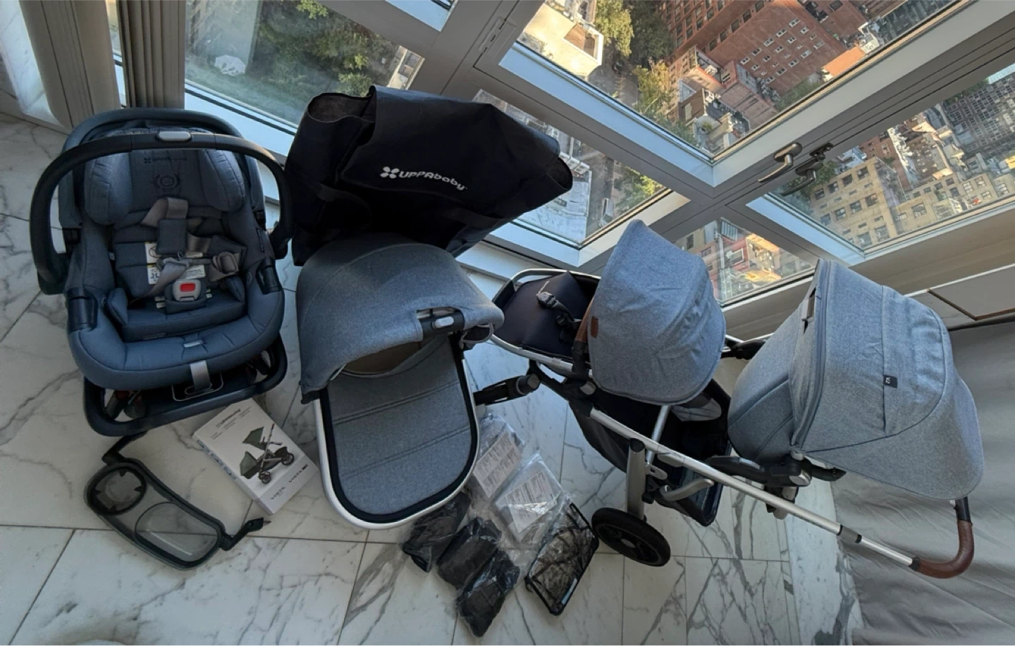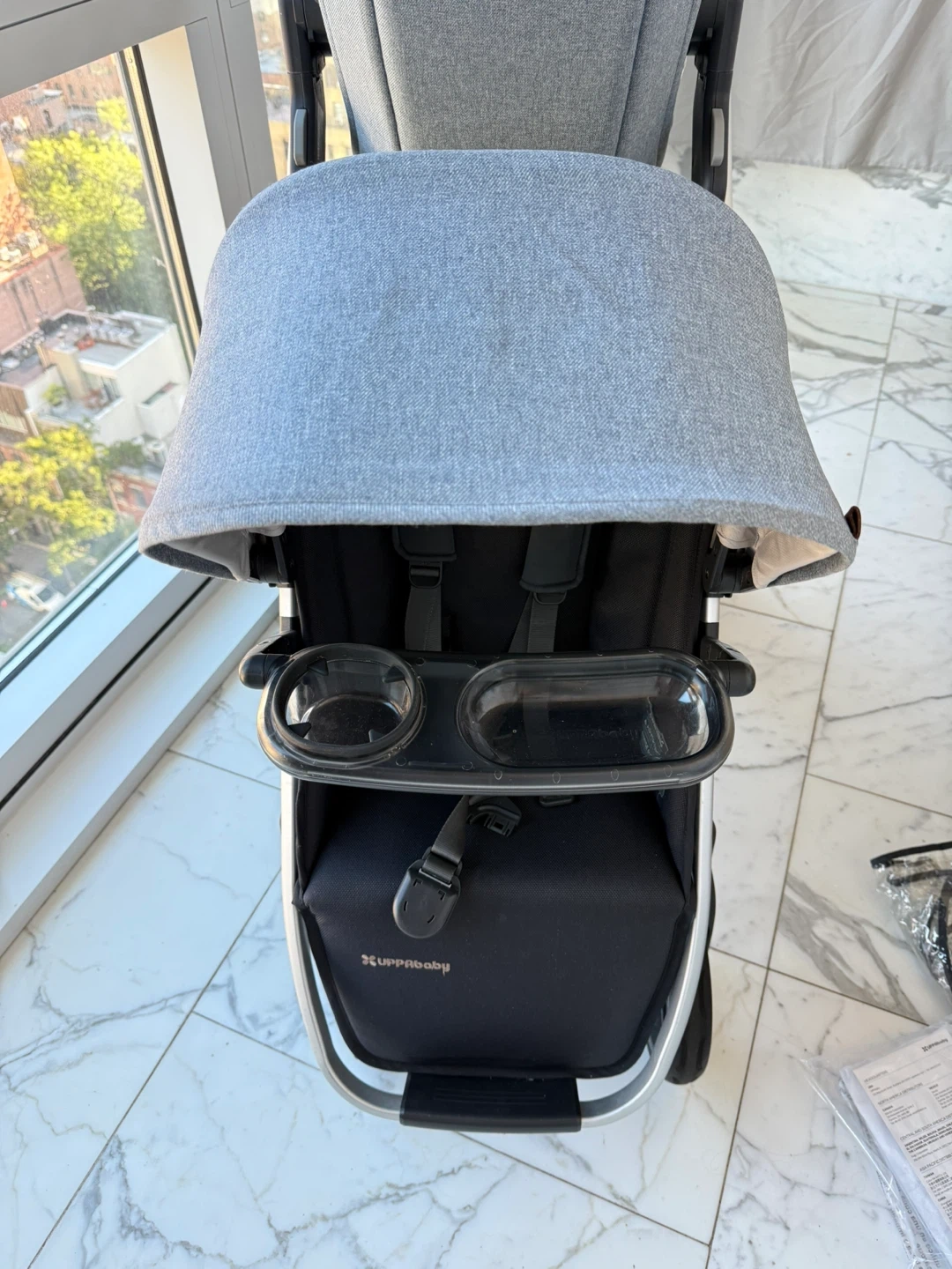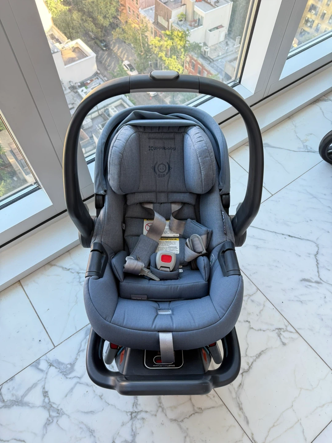 Selling our UPPAbaby Vista V2 stroller in perfect condition! (Lightly used and well taken care of) This stroller is known for its versatility and smooth ride. Comes with multiple configurations for different ages and stages. Comes with: Stroller with tow seats and bassinet(Gregory/bleu melange color), car seat mesa max (matching color) with infant insert and base(never been in an accident and expiration date 2030), snack tray, all rain covers and bug shields included (for both seats and bassinet) and they are all brand new, also all adapters are included (upper, lower,bassinet), all instructions comes with the set are included. Perfect for growing families! Everything has been cleaned!