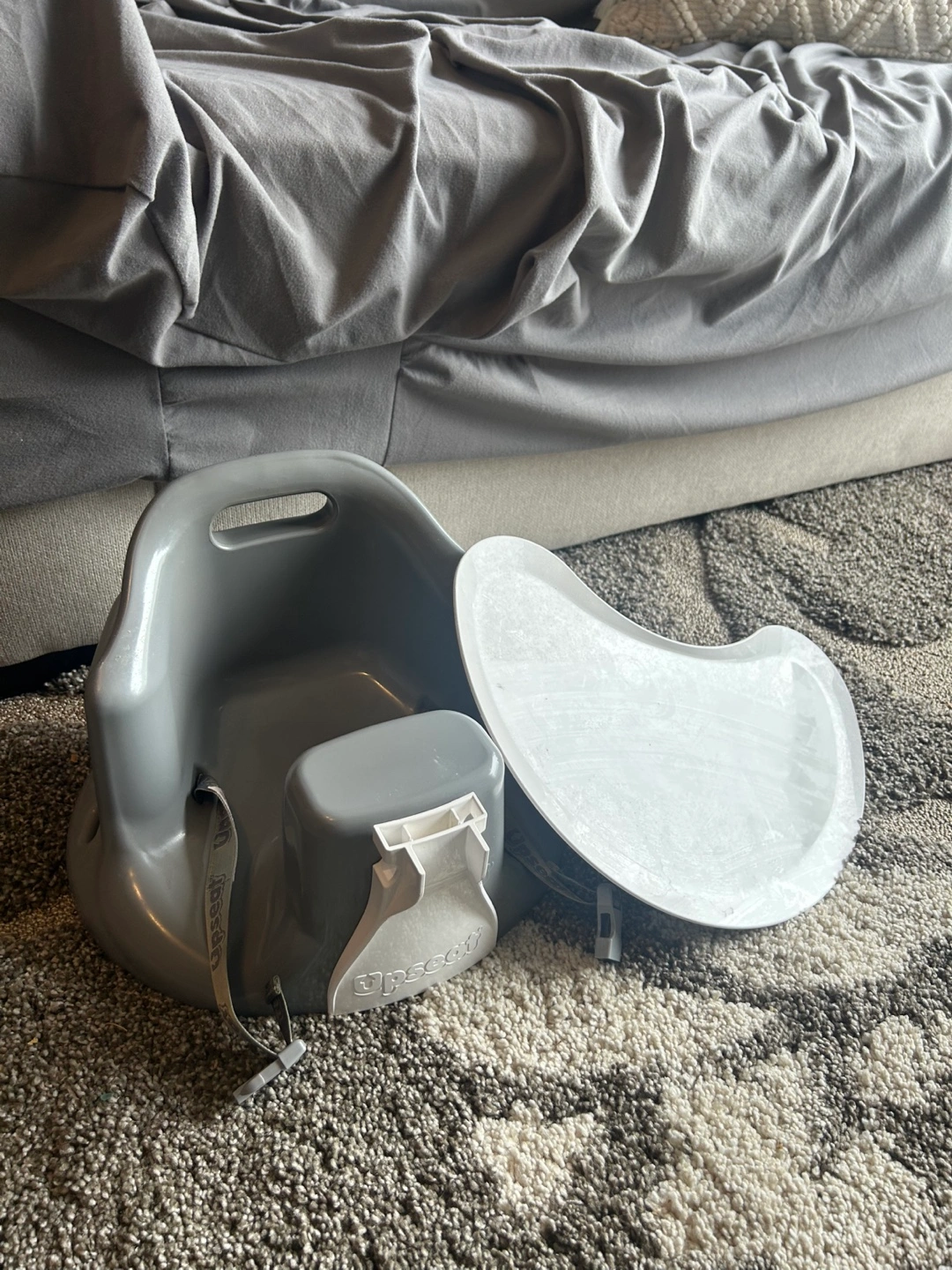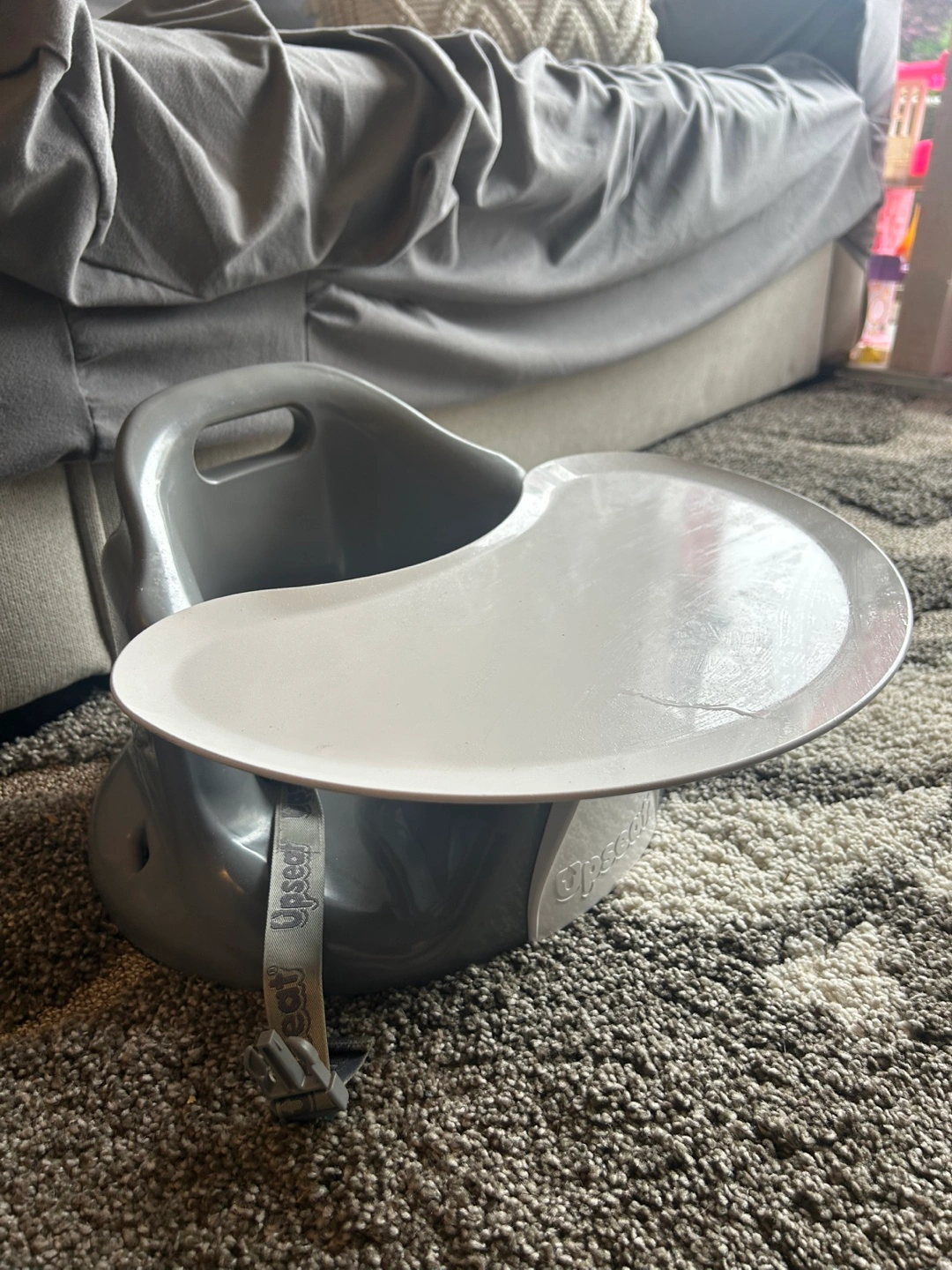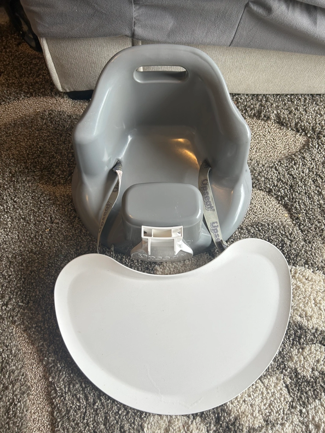 Gray portable booster Upseat. Includes attached tray. Easy to clean. Great for travel or feeding. Equipped with seatbelt for safety as well as straps to attach to any chair !