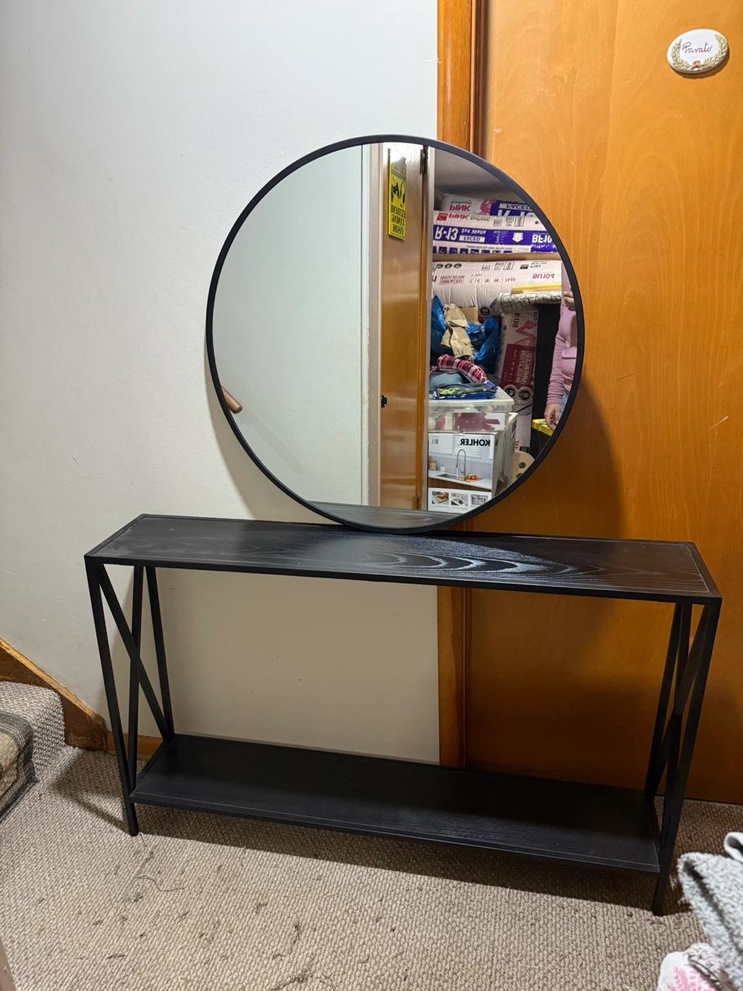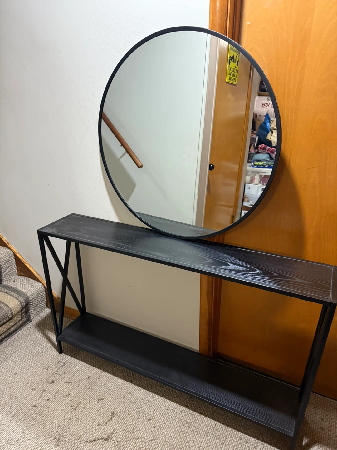 Selling a stylish black entryway table paired with a round mirror. This set is perfect for adding a touch of modern elegance to your home's entrance. The table features a sleek design with a lower shelf for storage, while the round mirror complements it beautifully. It's in great condition and ready to enhance your space