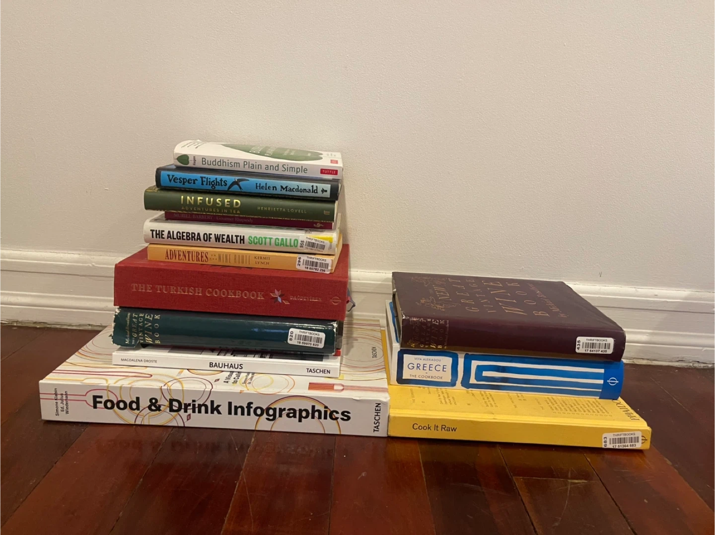 Eleven books covering various topics including cooking, wine, and general knowledge. Titles include 'Food & Drink Infographics,' 'The Turkish Cookbook,' 'Greece: The Cookbook,' and 'Cook It Raw.' Other books cover topics like wealth, tea, and philosophy. Bundle only. Pickup march 28, 9-11am