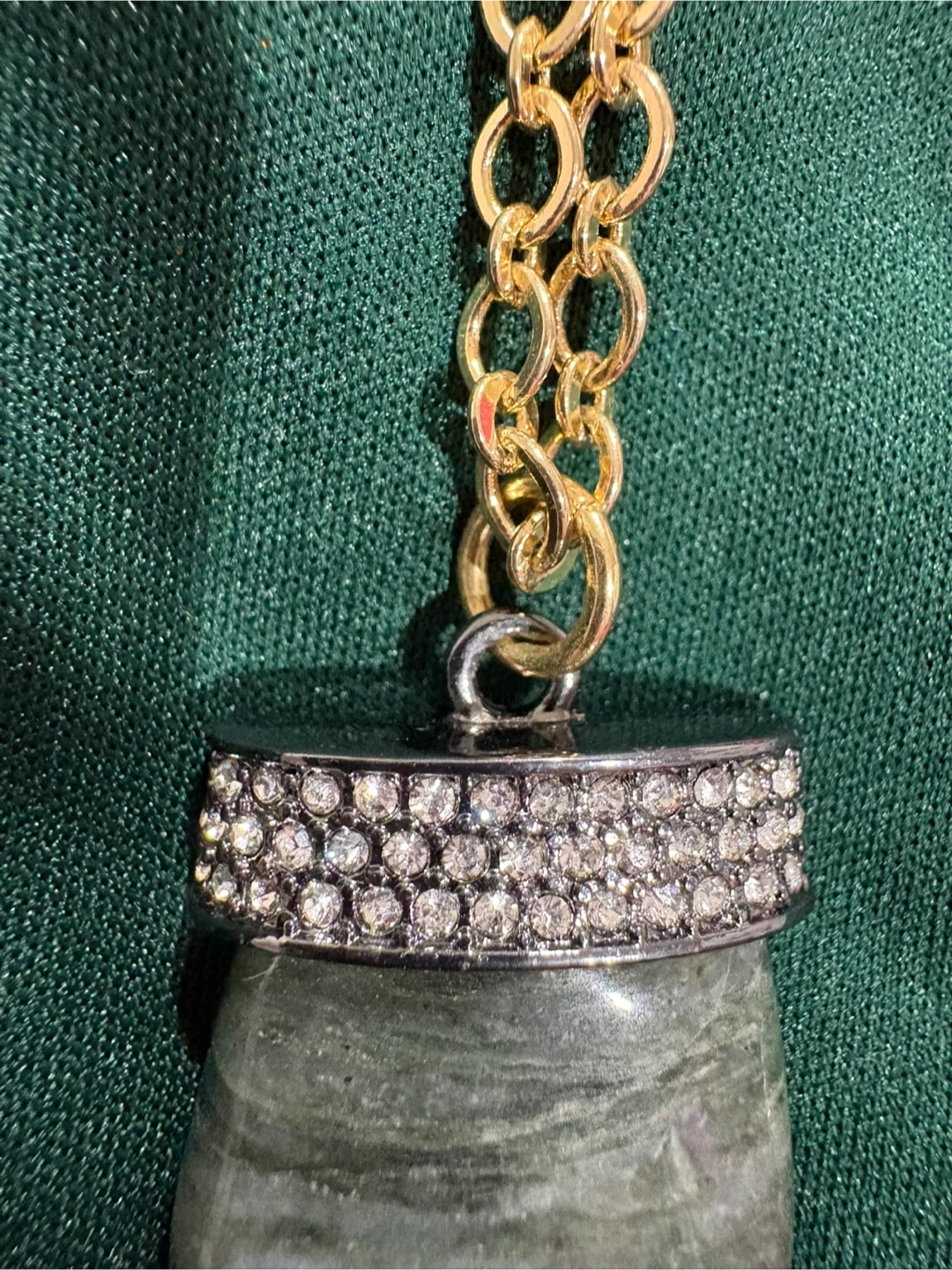 This necklace features a gold-tone chain and a unique stone pendant. The pendant is adorned with small, clear rhinestones around its top. The chain has a secure clasp closure. It's a stylish accessory!