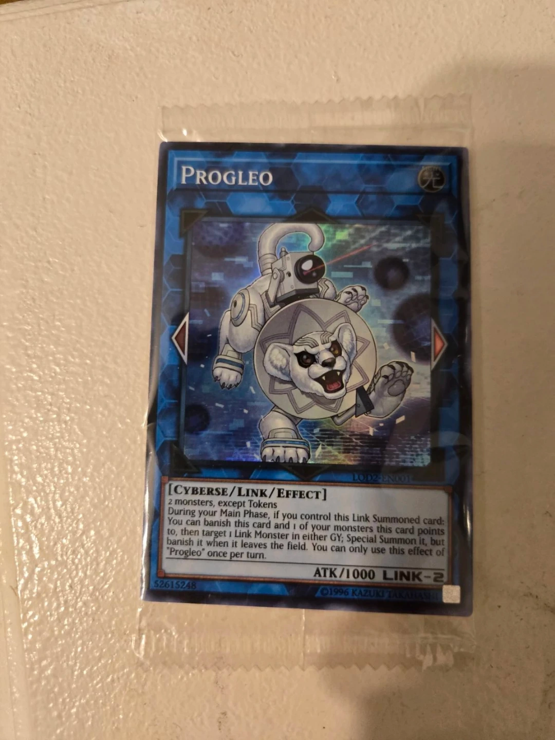 This is the Prog Leo Link-2 monster card from Yu-Gi-Oh! It has 1000 ATK and its effect allows for special summoning. The card number is LOD2-EN001.