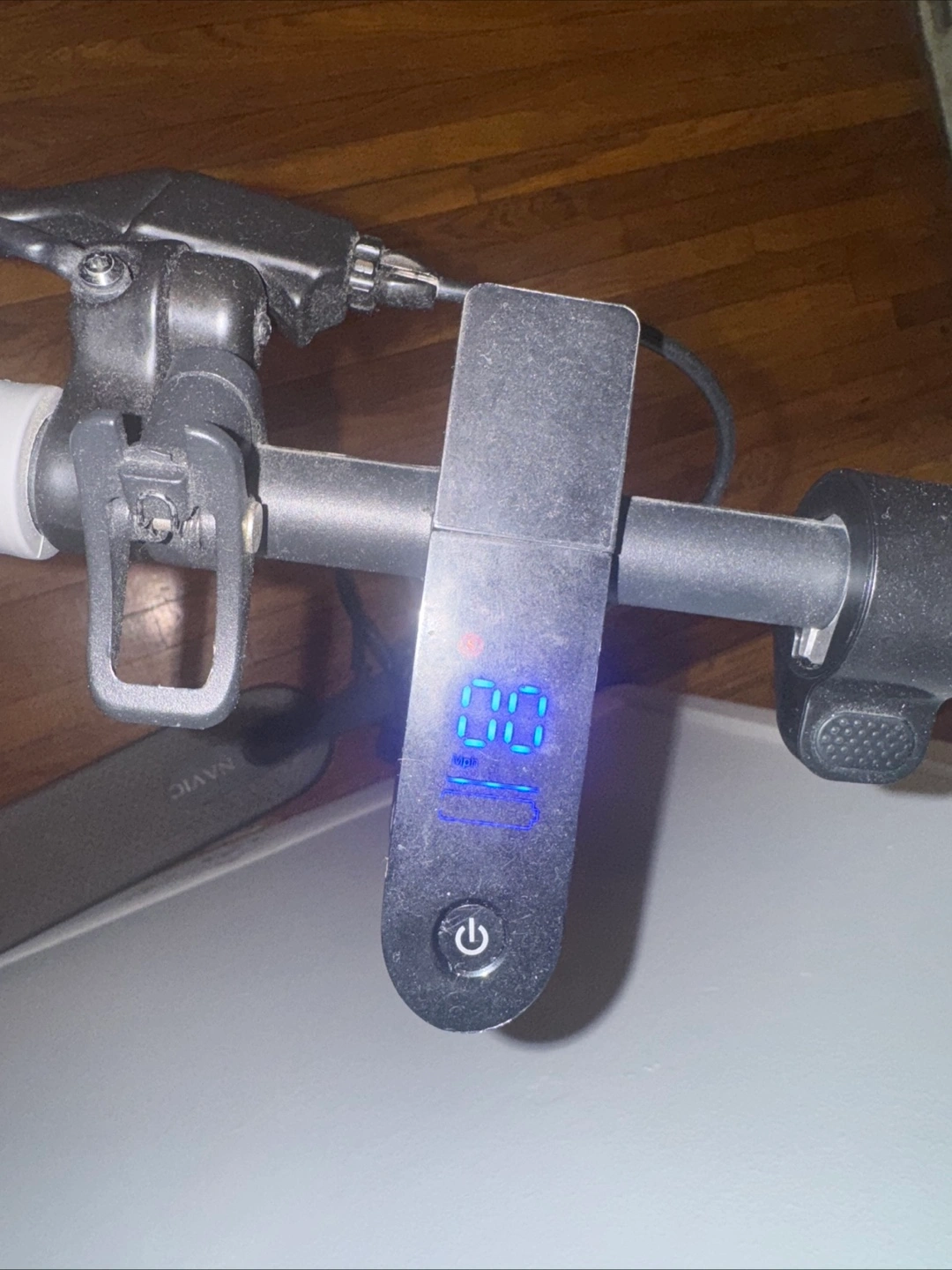 Foldable electric scooter. Gray and black. Digital display shows speed and battery life. Good condition. Used.