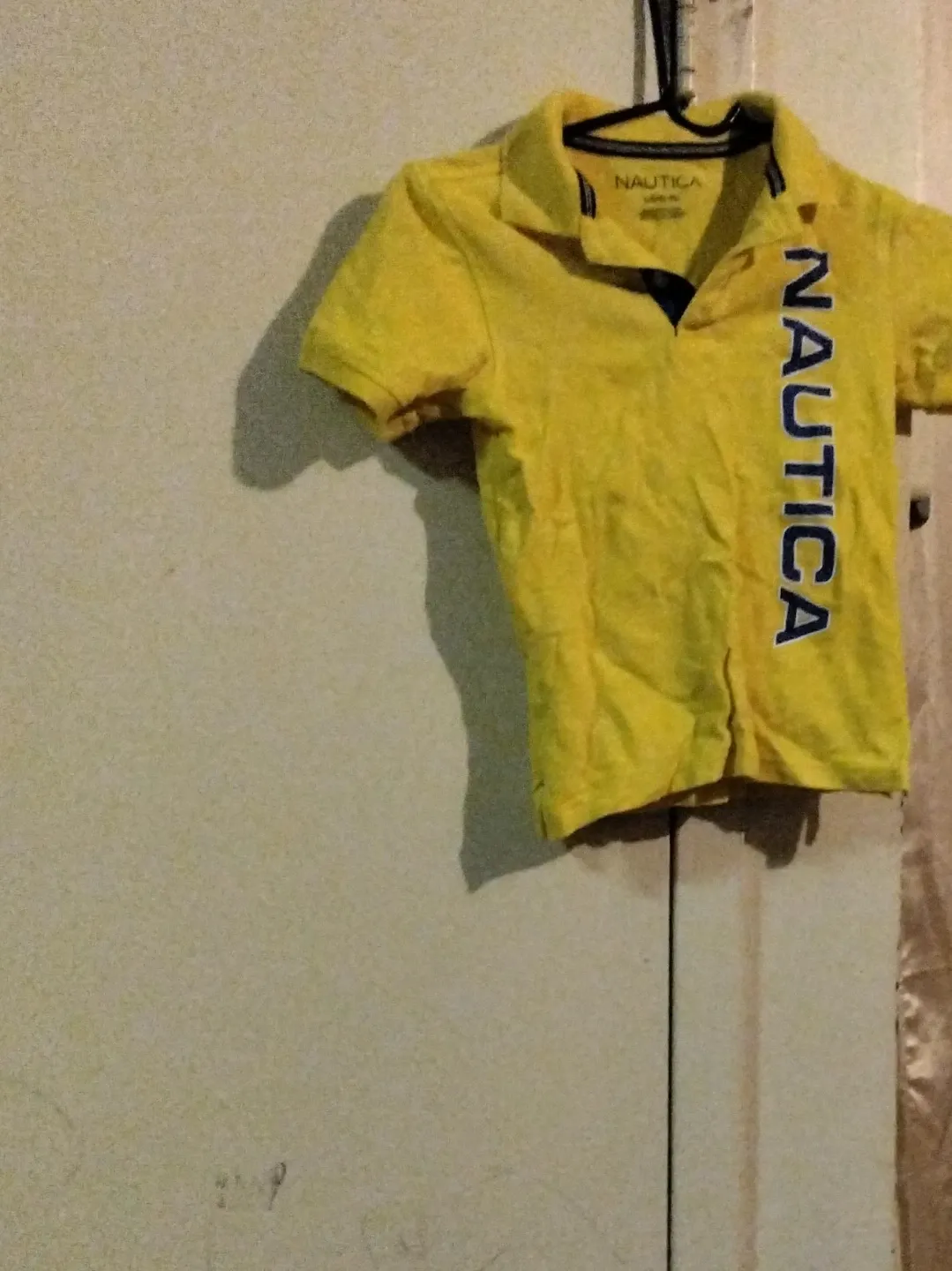 Nautica yellow short-sleeve polo shirt. Features the Nautica logo printed vertically on the side. It's made of cotton.