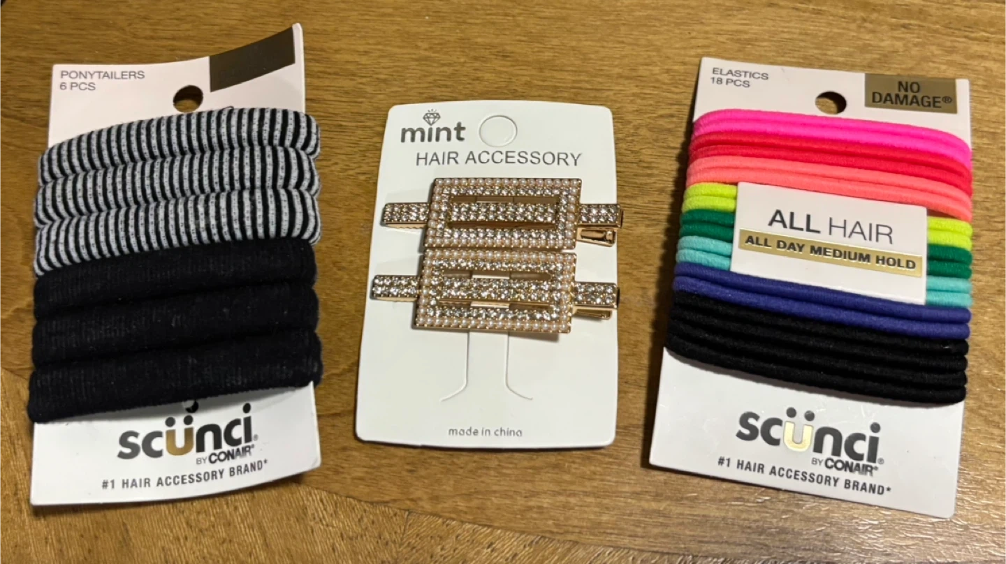 Brand New Lot of 3 Selling a variety of hair accessories! You'll get: - Scunci ponytailers (6 pcs) in black and white stripes and solid black - Mint hair accessory hair clips - Scunci elastics (18 pcs) in assorted colors