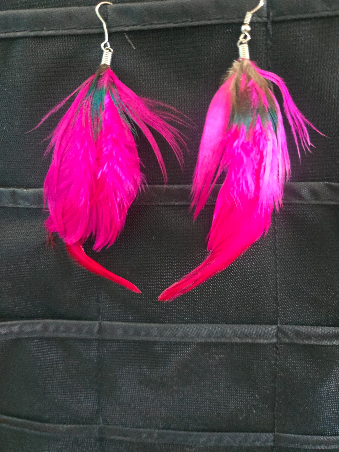 Fun, dangly earrings featuring bright hot pink feathers. They have a green accent near the top and a hook backing. Feather material.