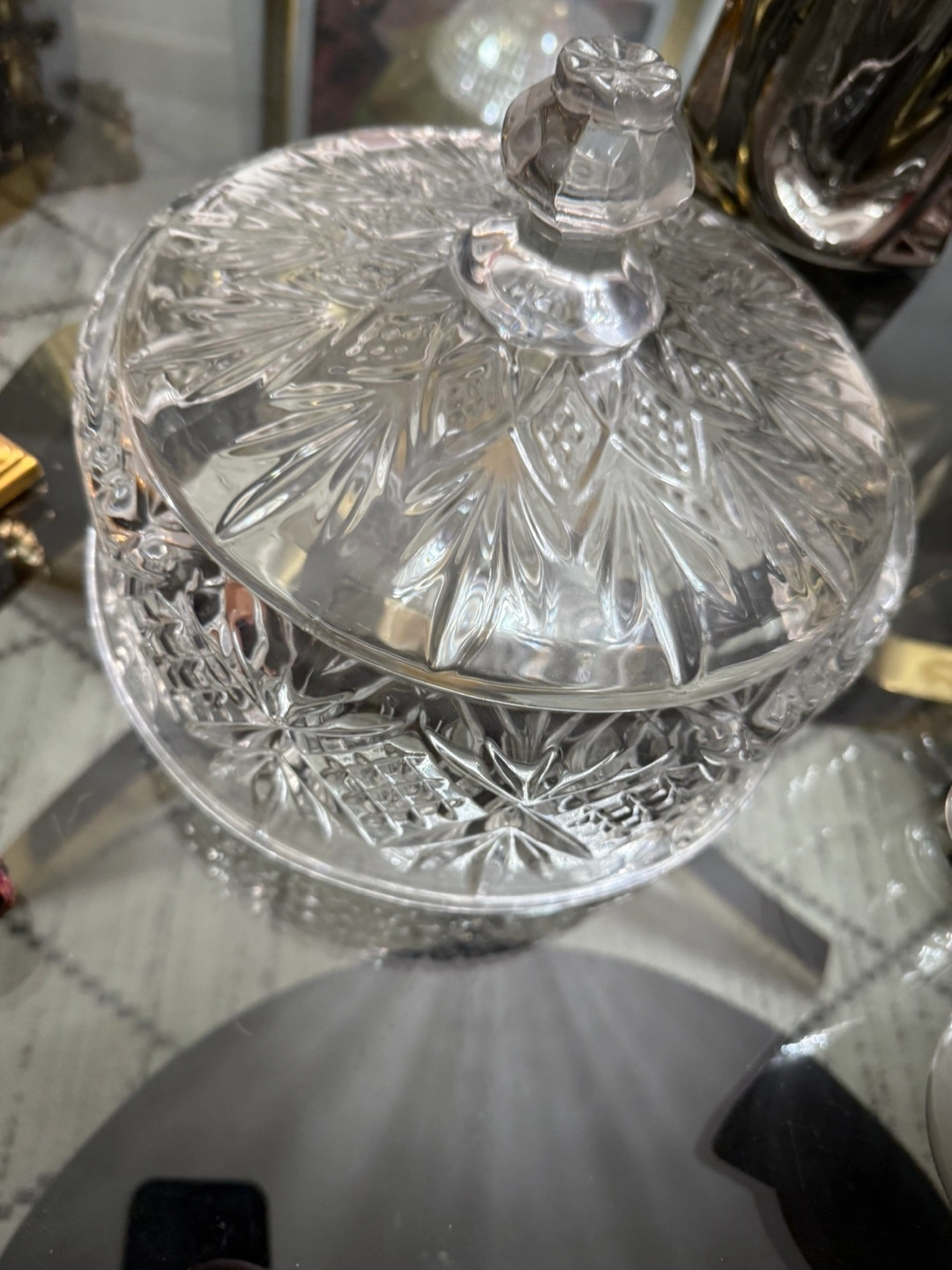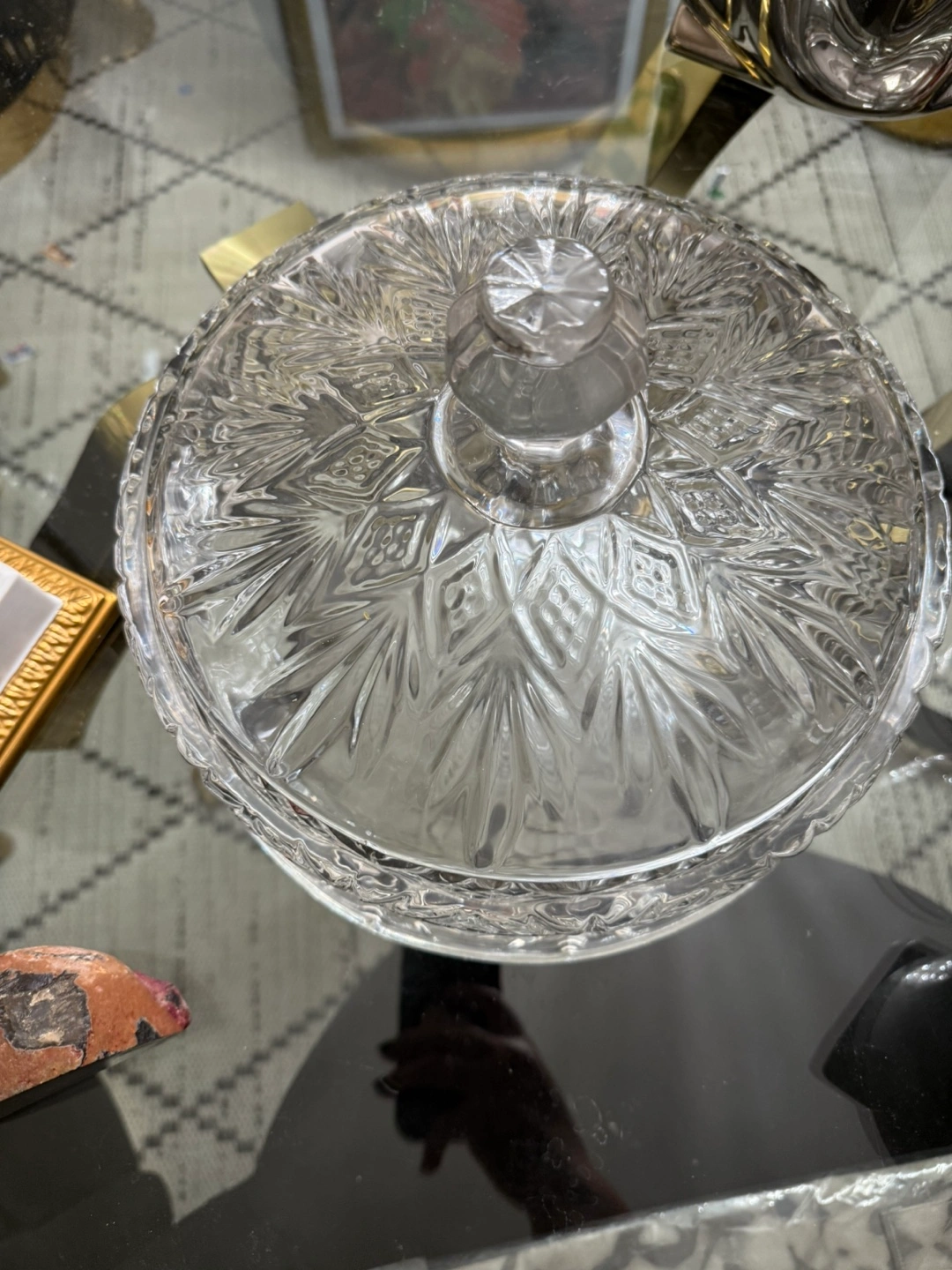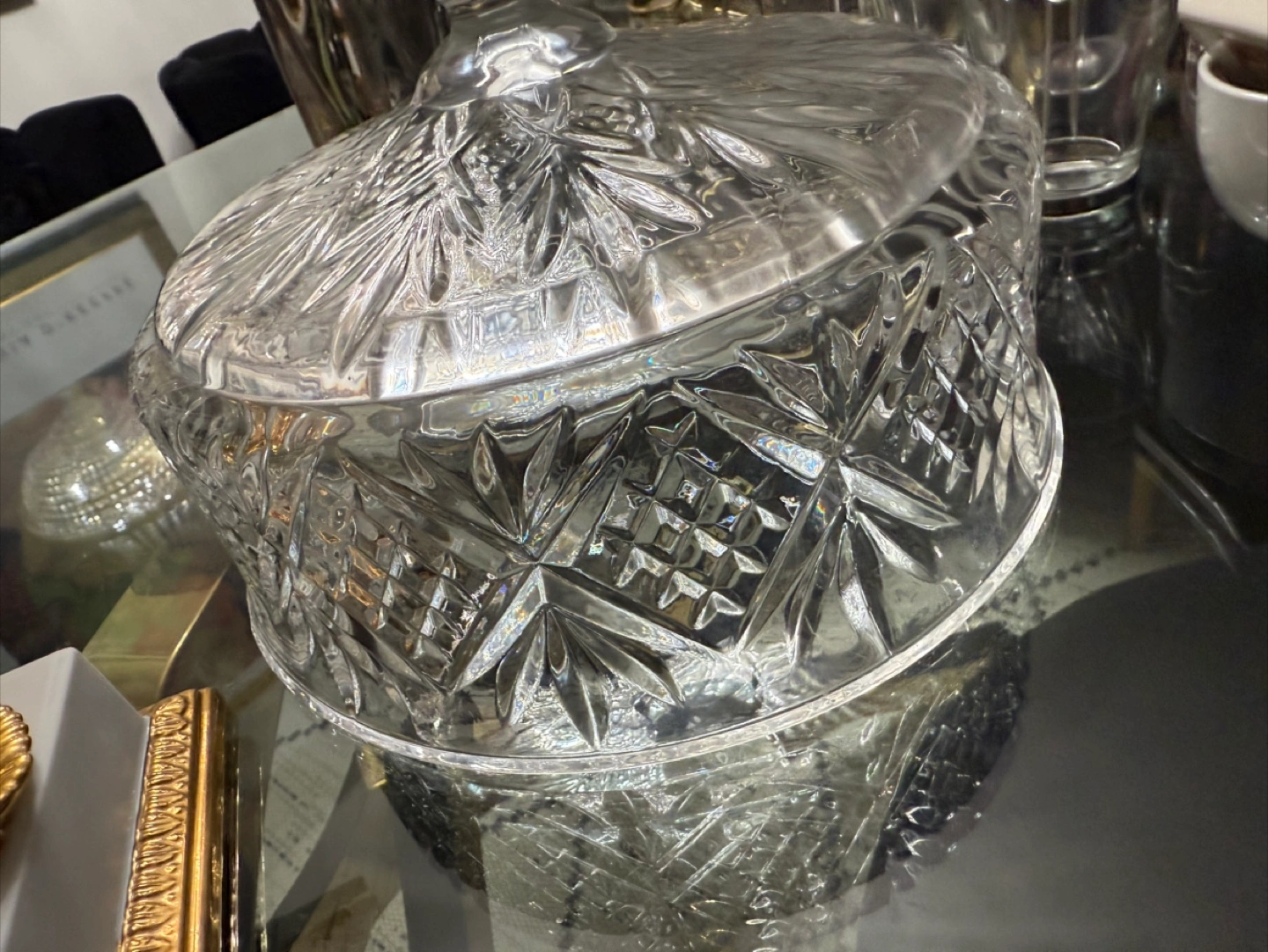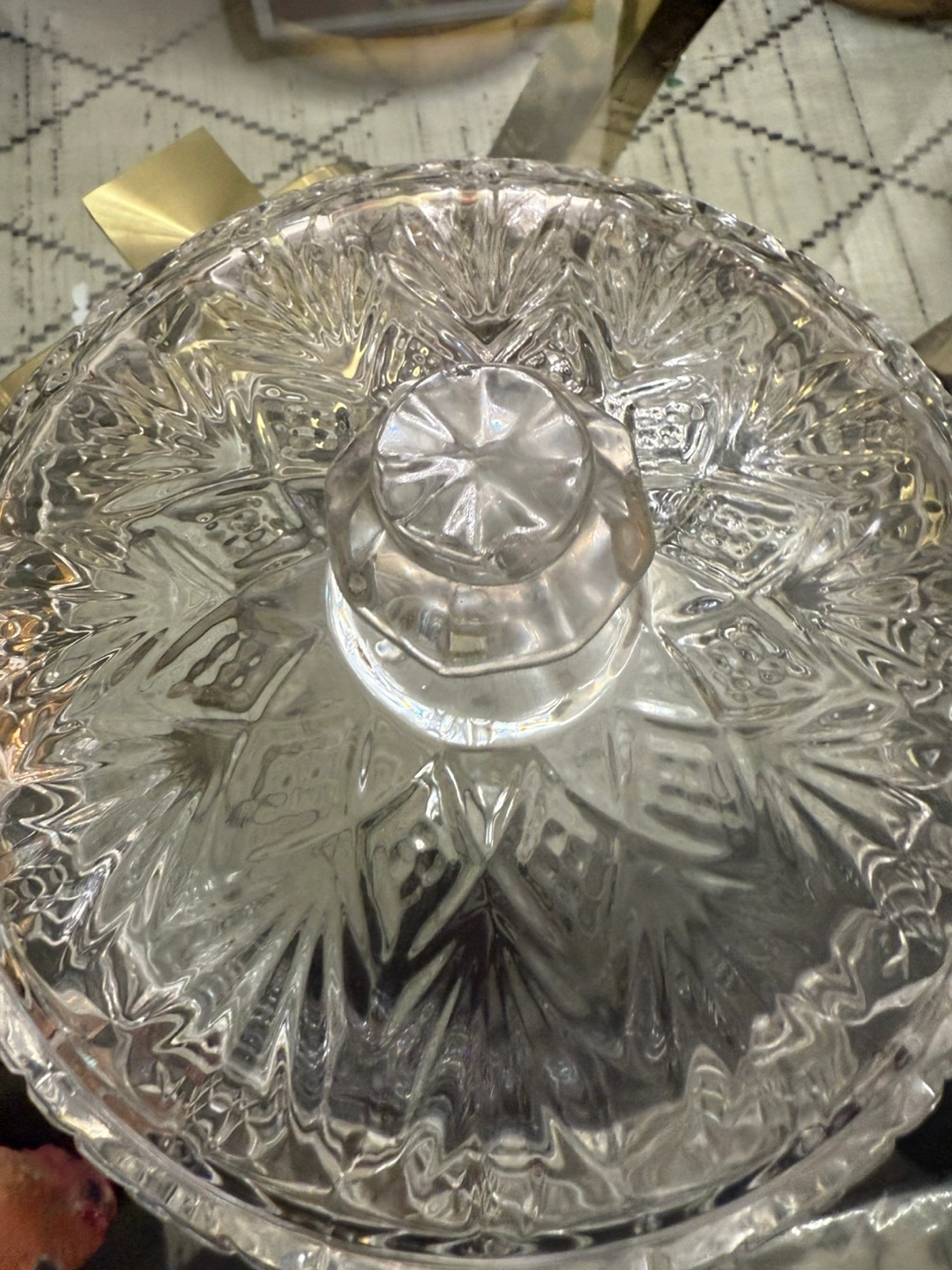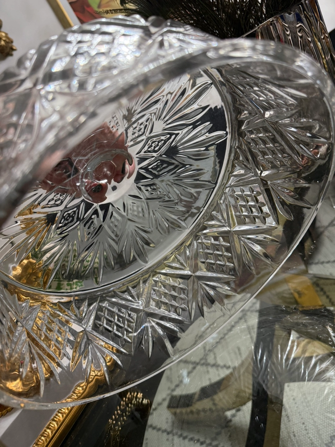 Selling a beautiful crystal lid for a cake , fruits and etc It has a lovely intricate design that catches the light beautifully. Perfect for adding a touch of elegance to your home!