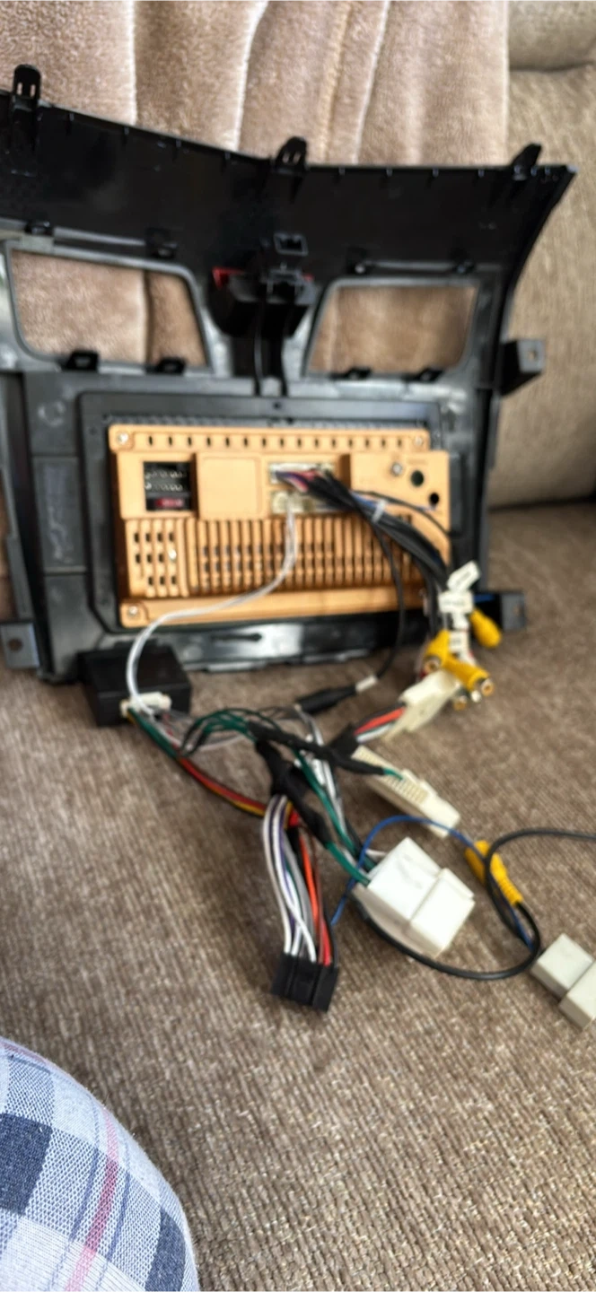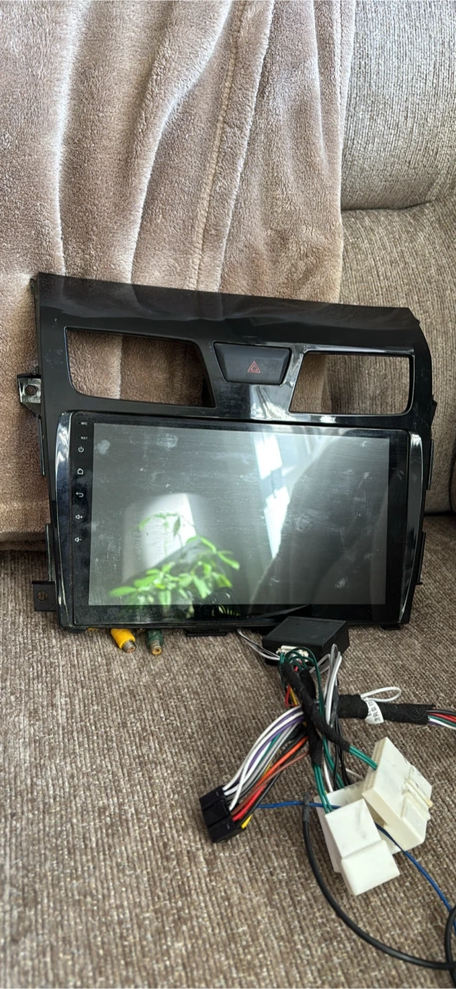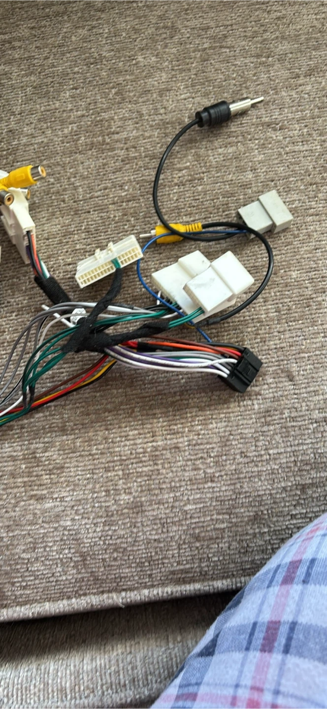 This is a car stereo system with a touchscreen display and all necessary wiring harnesses. It's a black unit designed for in-dash mounting. The system includes multiple connector cables for installation. It's ready to upgrade your car's audio.