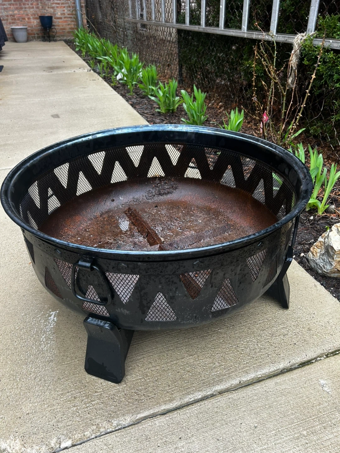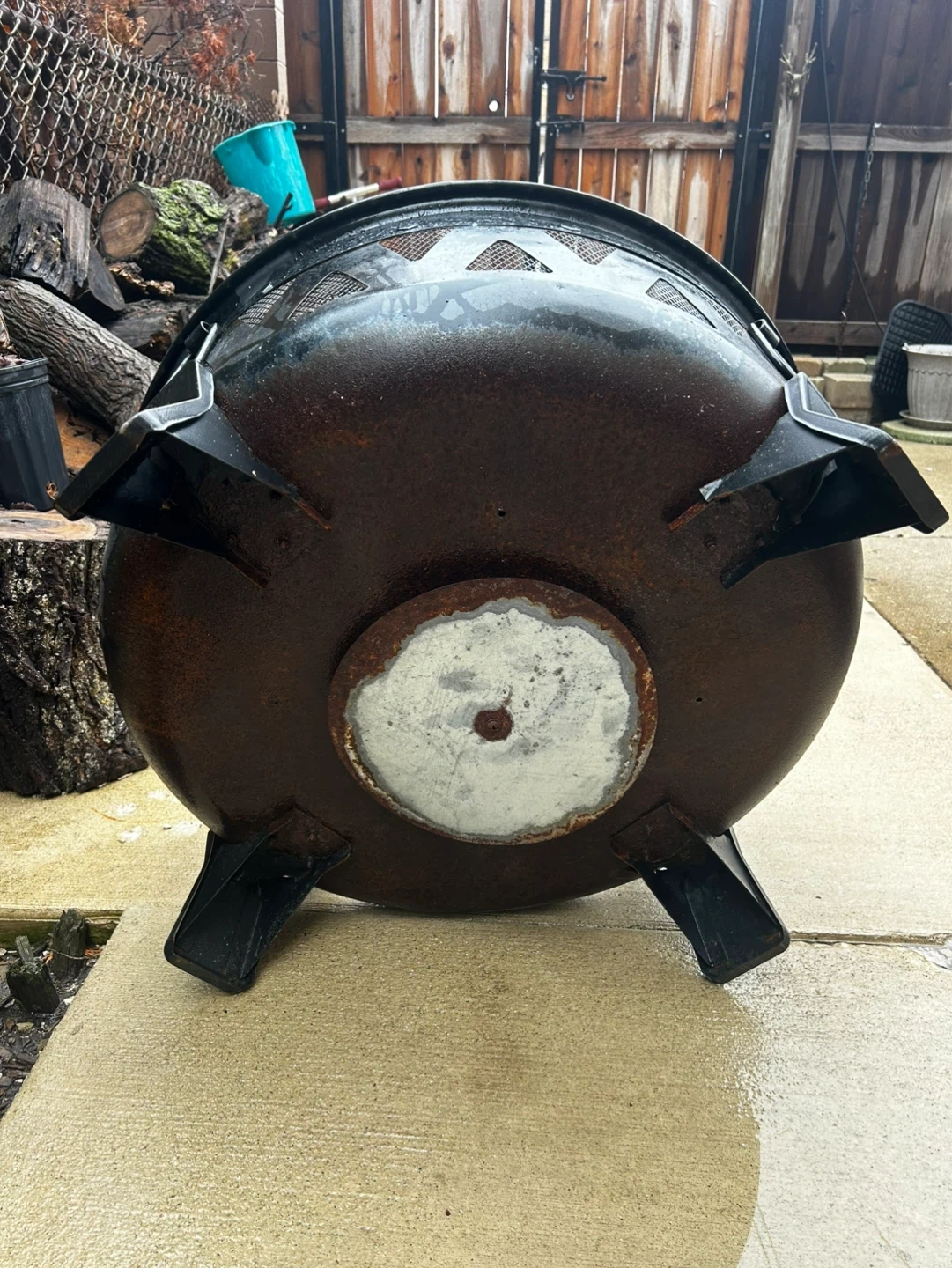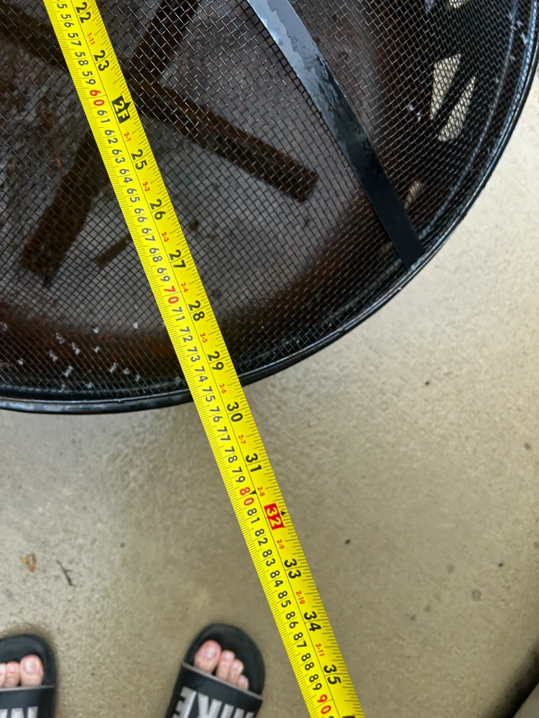 This round metal fire pit is perfect for your backyard or patio. It's made of durable metal and comes with a mesh spark screen to keep embers contained. The fire pit measures approximately 30”inches in diameter. No holes under the fire pit. Great for outdoor gatherings and cozy evenings!