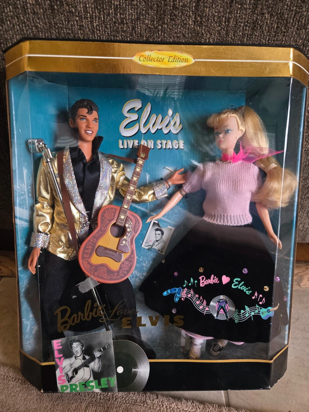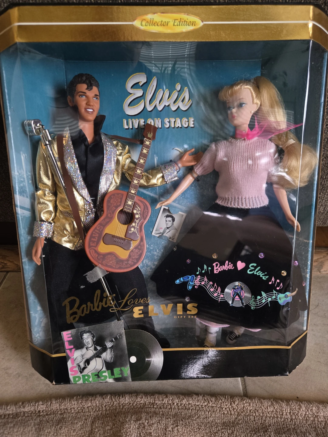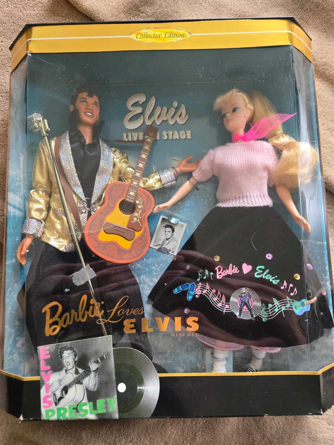 This is the Barbie Loves Elvis Collector Edition doll set, featuring Elvis "Live on Stage". Includes Barbie and Elvis dolls, outfits, guitar, and microphone. It's a gift set from 1994 celebrating Elvis Presley's early career.
