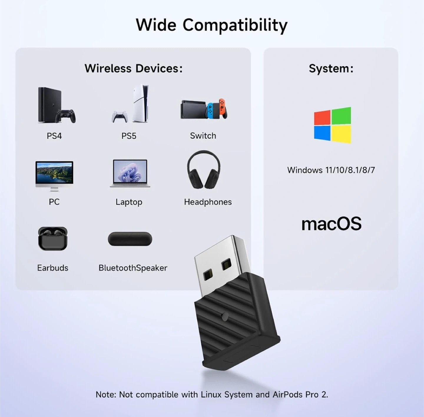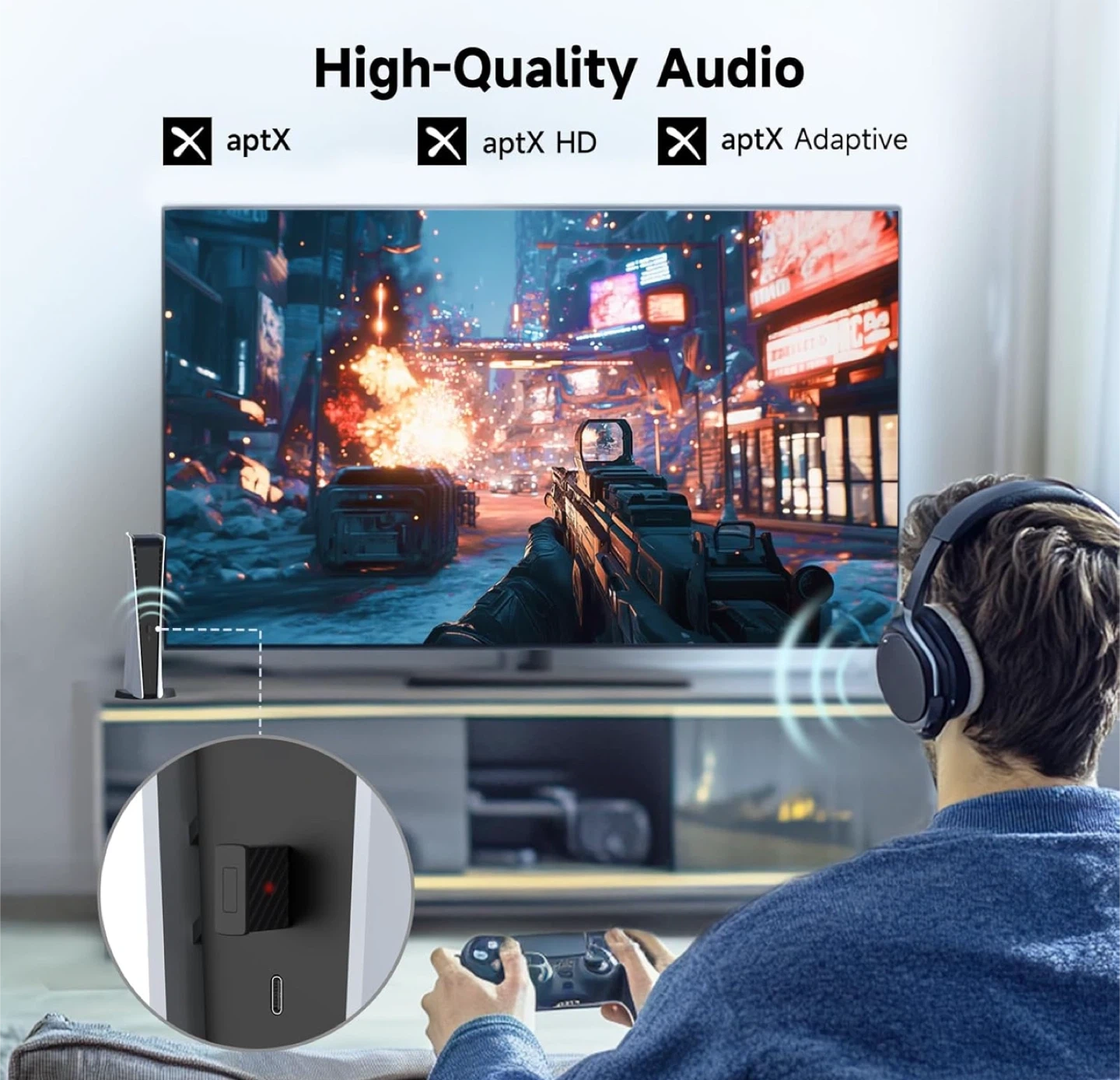 USB Bluetooth Adapter for PS5 - USB-C Wireless Audio Bluetooth 5.3 Transmitter with APTX Low Latency & aptX-Adaptive, Plug & Play for Headphone/Earbuds/PS4/Switch/Laptop/PC