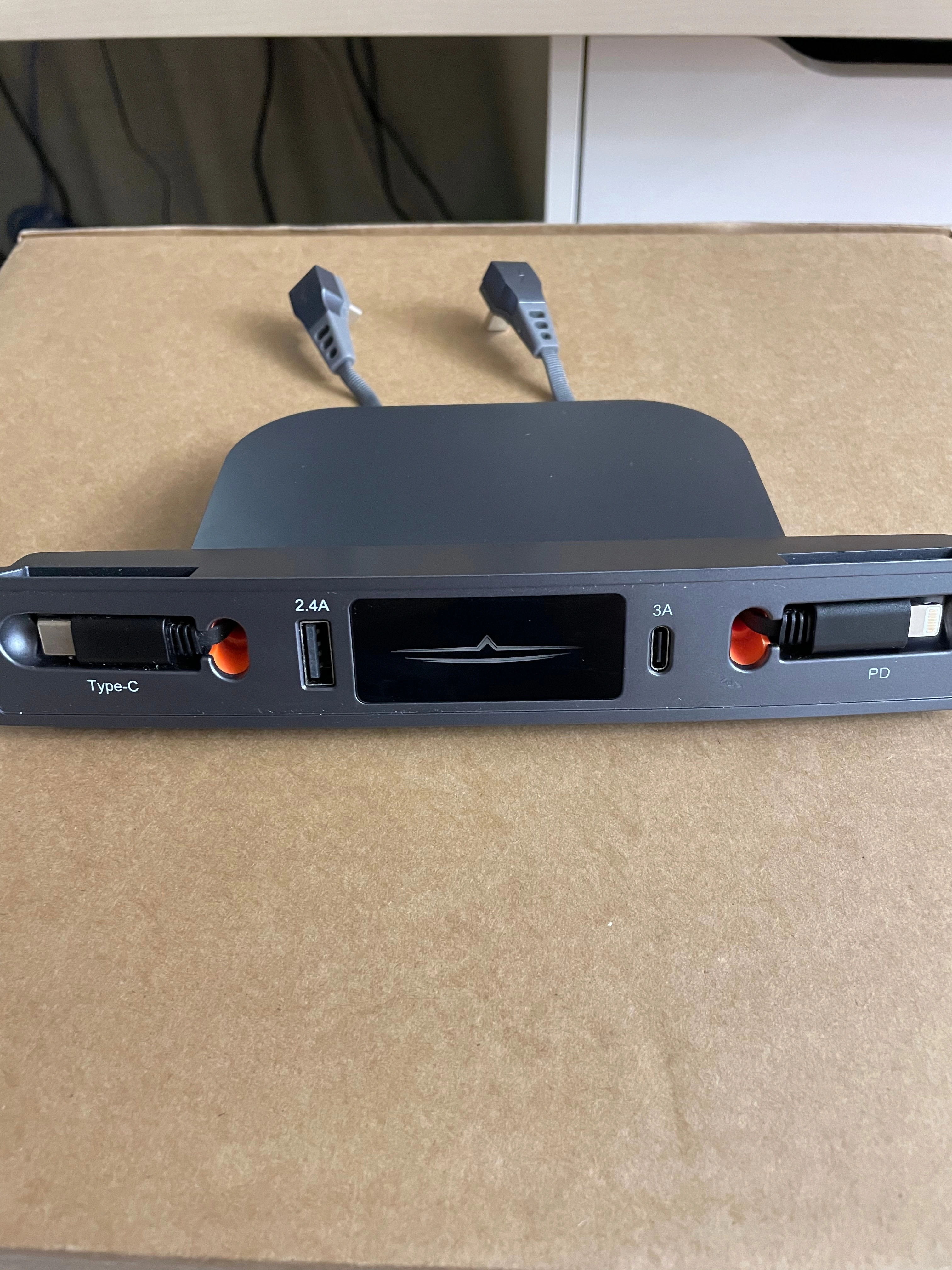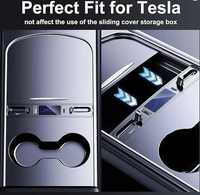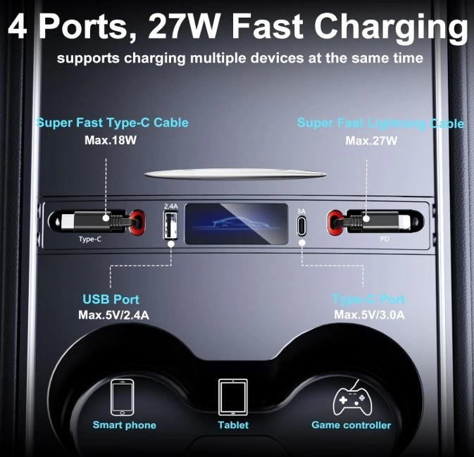 USB Hub for Tesla Model 3/Y (2023/2022/2021), 4-in-2 Docking Station with 2 USB Port and 2 Type-C Port, Car Fast Charger and Data Transmission, Central Console Accessories for Tesla. This Tesla model 3/Y charging cable hole hub has four ports,include 1 USB-A port and 1 USB-C port,and two 80cm retractable fast charging cables that support Type-C and lightening charging respectively. Perfect working condition.