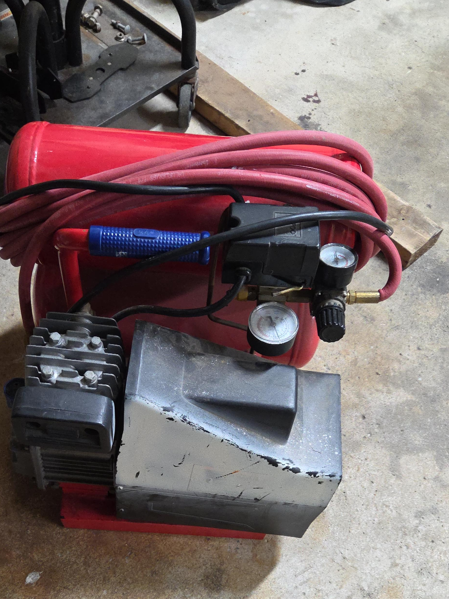 Selling a used air compressor. It shows signs of wear and use, as you can see in the photos. It includes a red hose and has a blue handle.