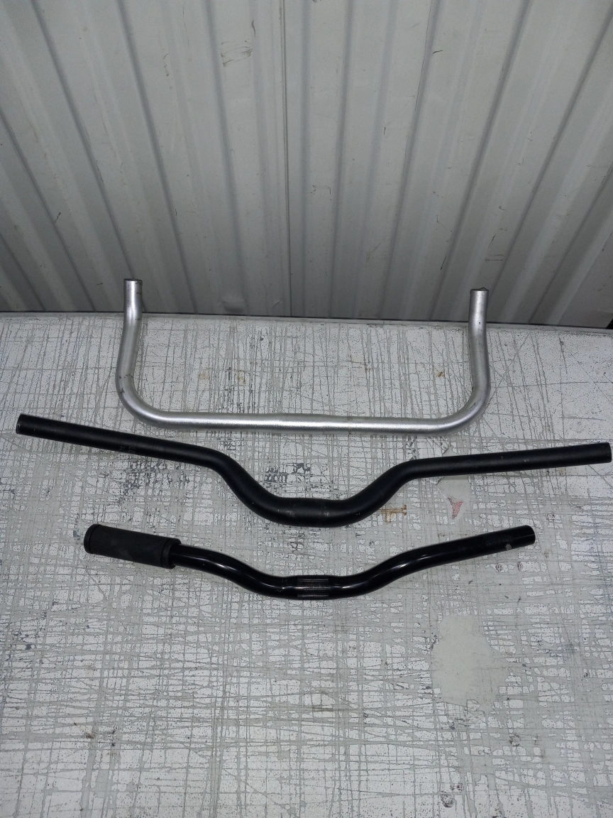 Selling a collection of used bike handlebars. There are several different styles and colors, including black and silver. Good for various bike types!