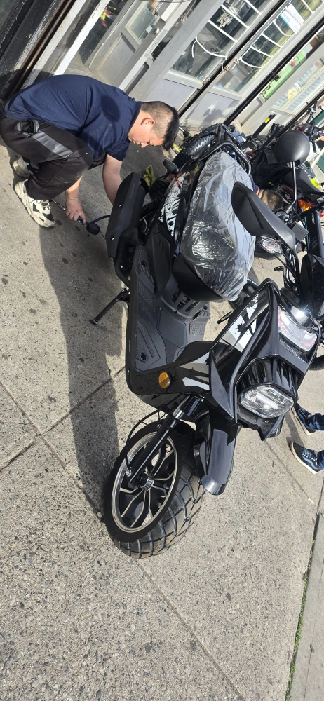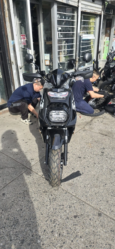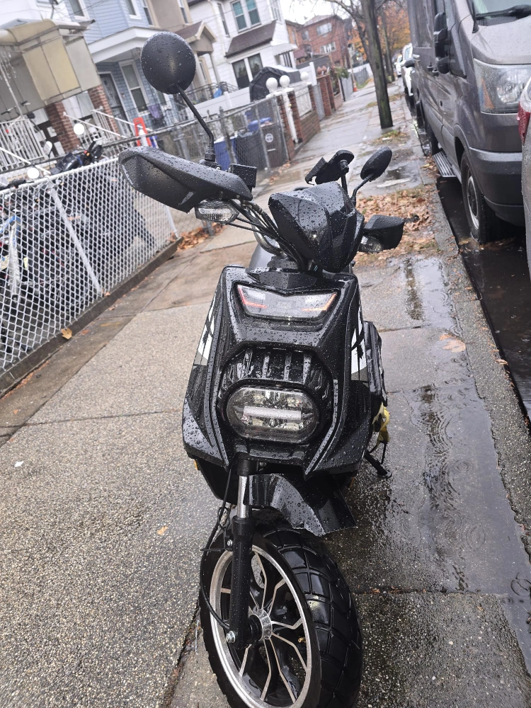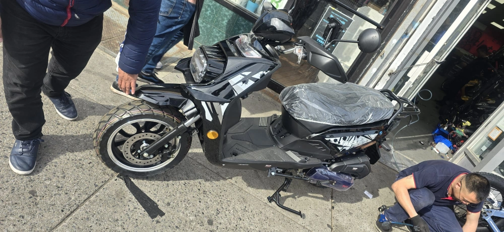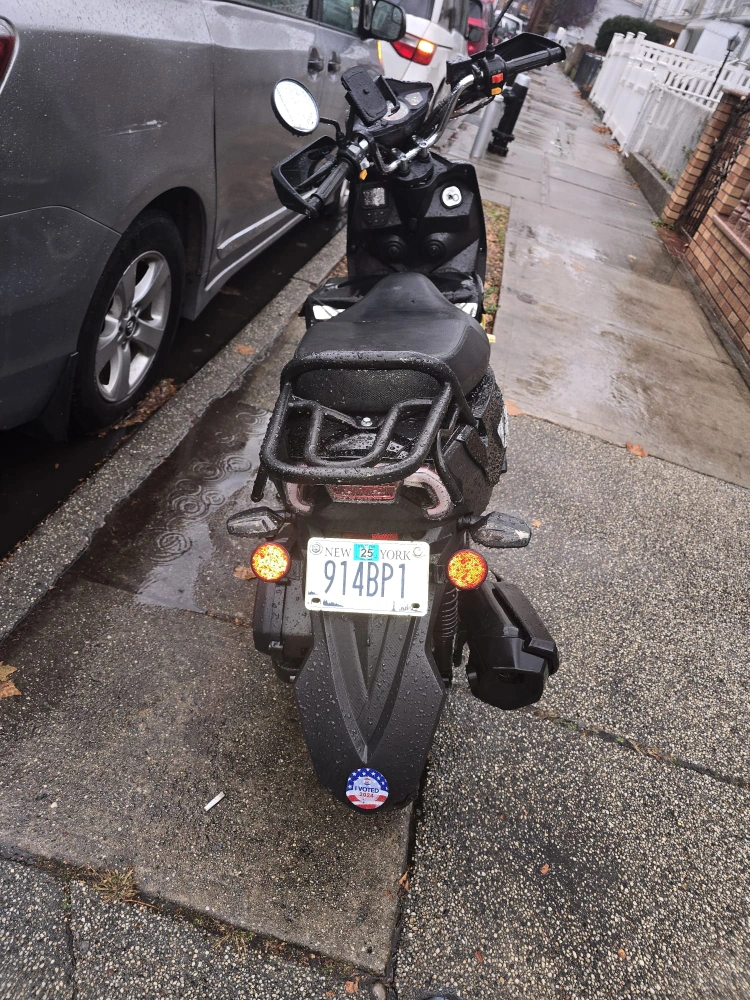 Gas powered scooter. Black with white accents. Looks to be in good condition. New York license plate.