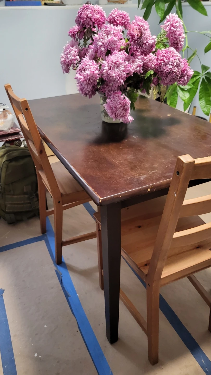 60Selling a used dining table with a couple of chairs. It has some signs of wear and tear, but it's still sturdy and functional. Perfect for a small dining area or kitchen!