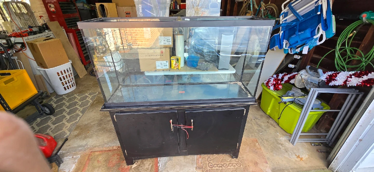 5Selling a used fish tank with a stand. It's a great setup for any aquarium enthusiast. It has a black stand with doors for storage. Perfect for creating a beautiful underwater world