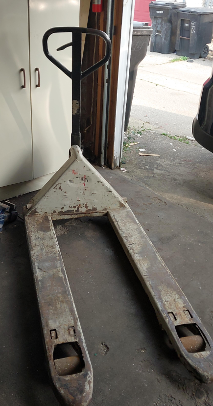 Selling a used pallet jack. It shows signs of wear and tear, but it's still functional. Perfect for moving heavy items around your garage or warehouse.