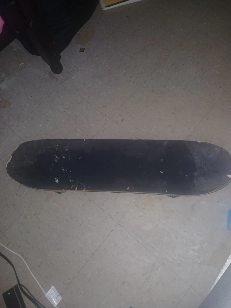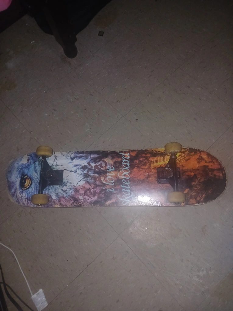 15Selling a used skateboard. It has a design on the bottom with the words "I love skateboard". It shows signs of wear, but it's still functional