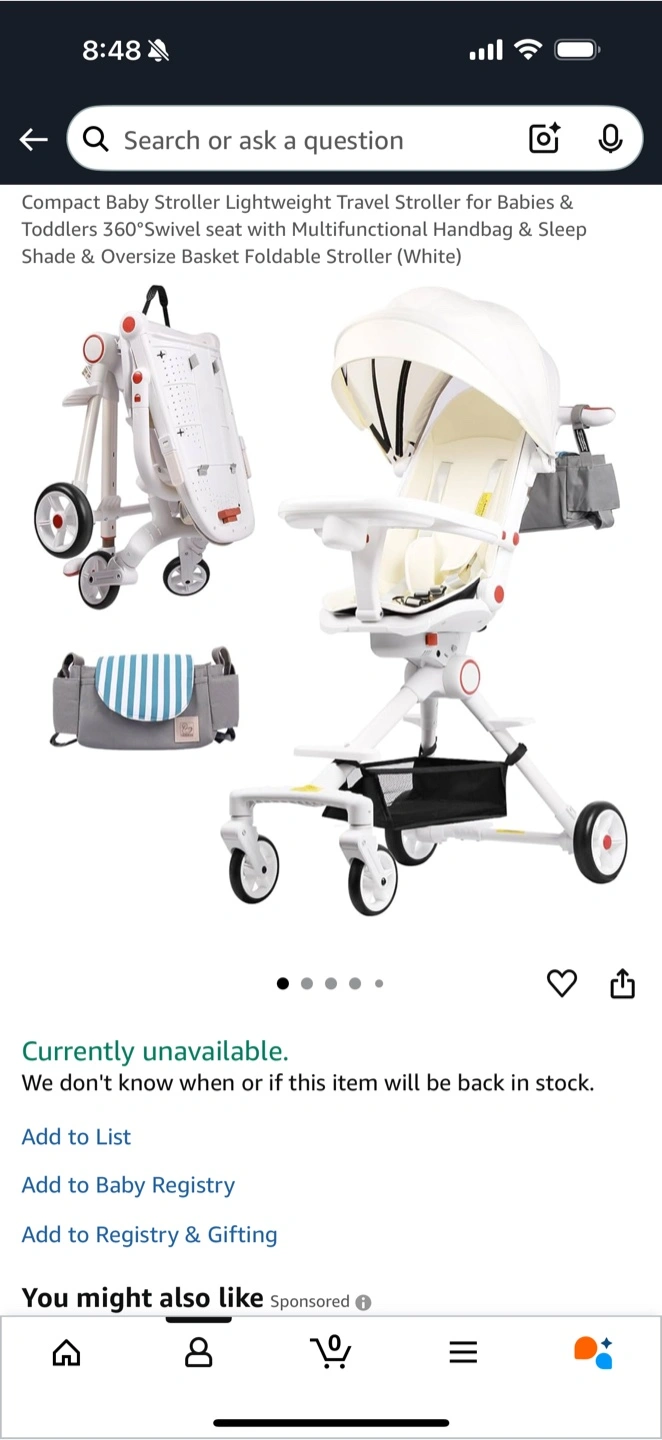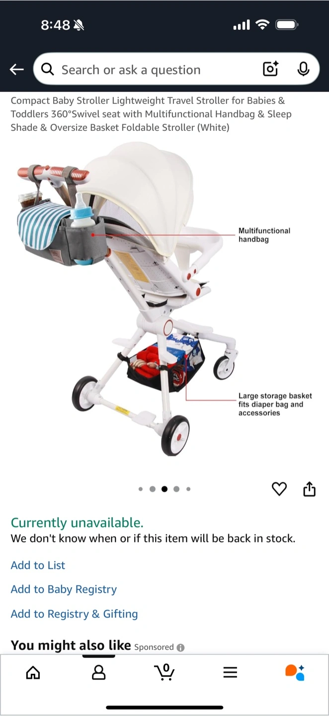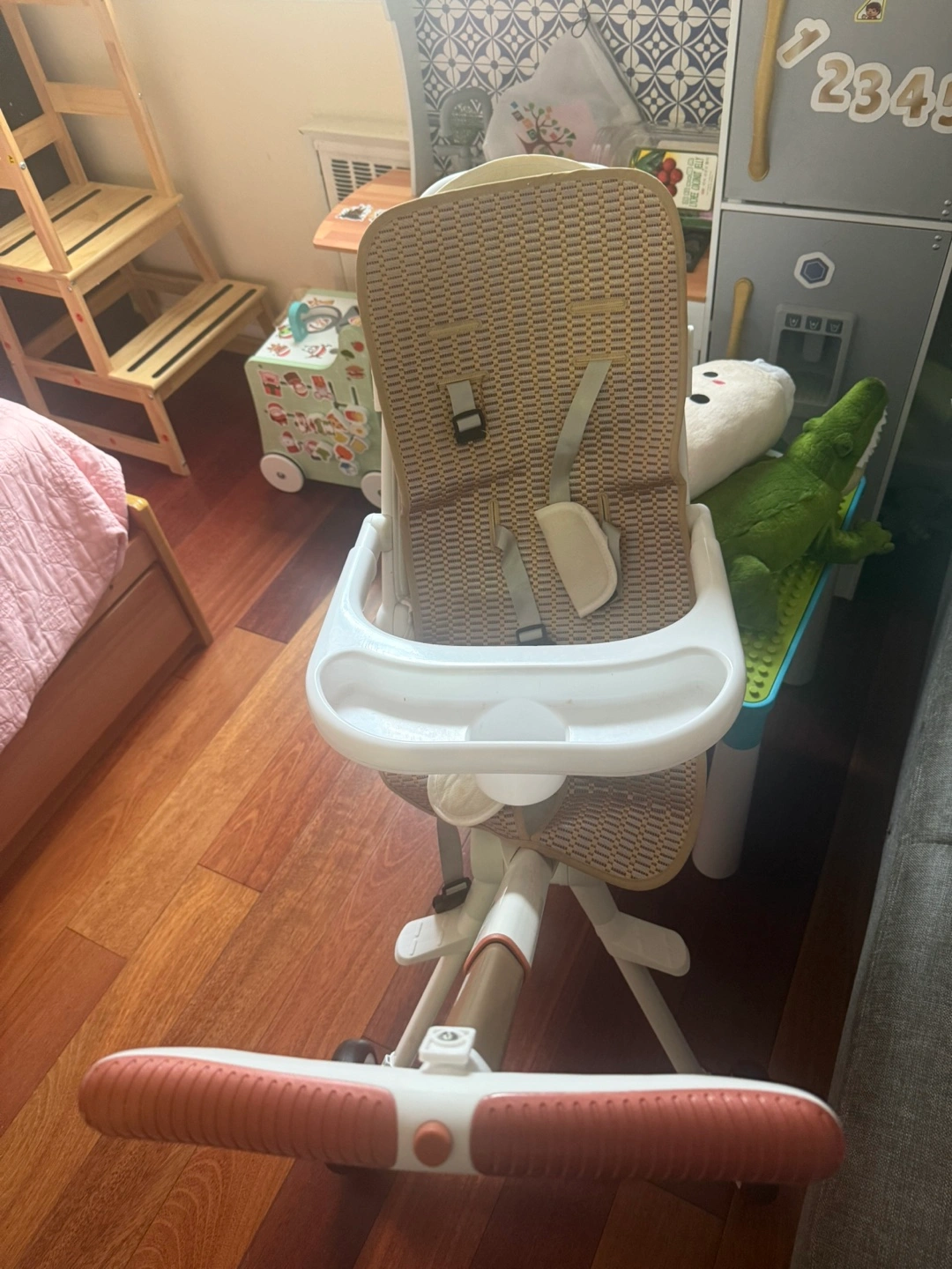 A white and beige stroller. A seat with a harness and tray. The stroller is on wheels and has a handlebar, perfect for easy maneuverability. The perfect way to take your little one on a relaxing stroll.