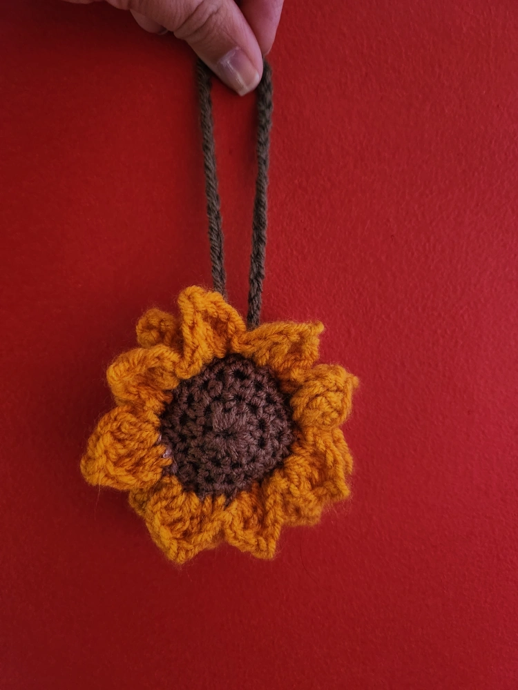 Handmade crochet sunflower ornament. Brown string for hanging. I made this with the intent of using as air freshener for cars. Simply spray the center with your favorite scent.