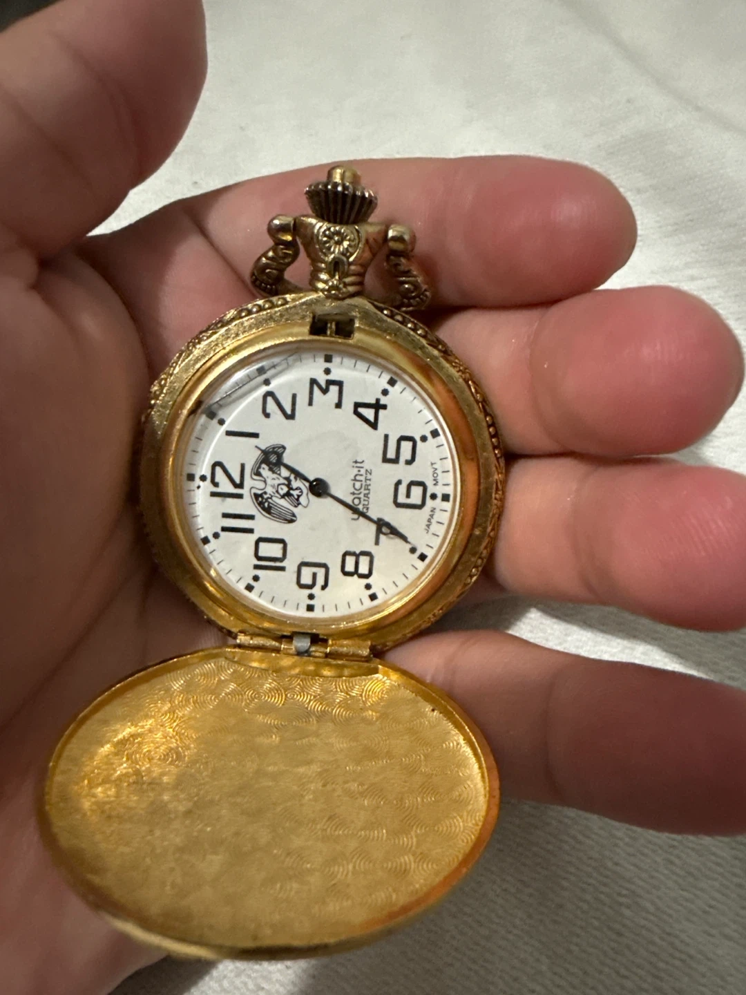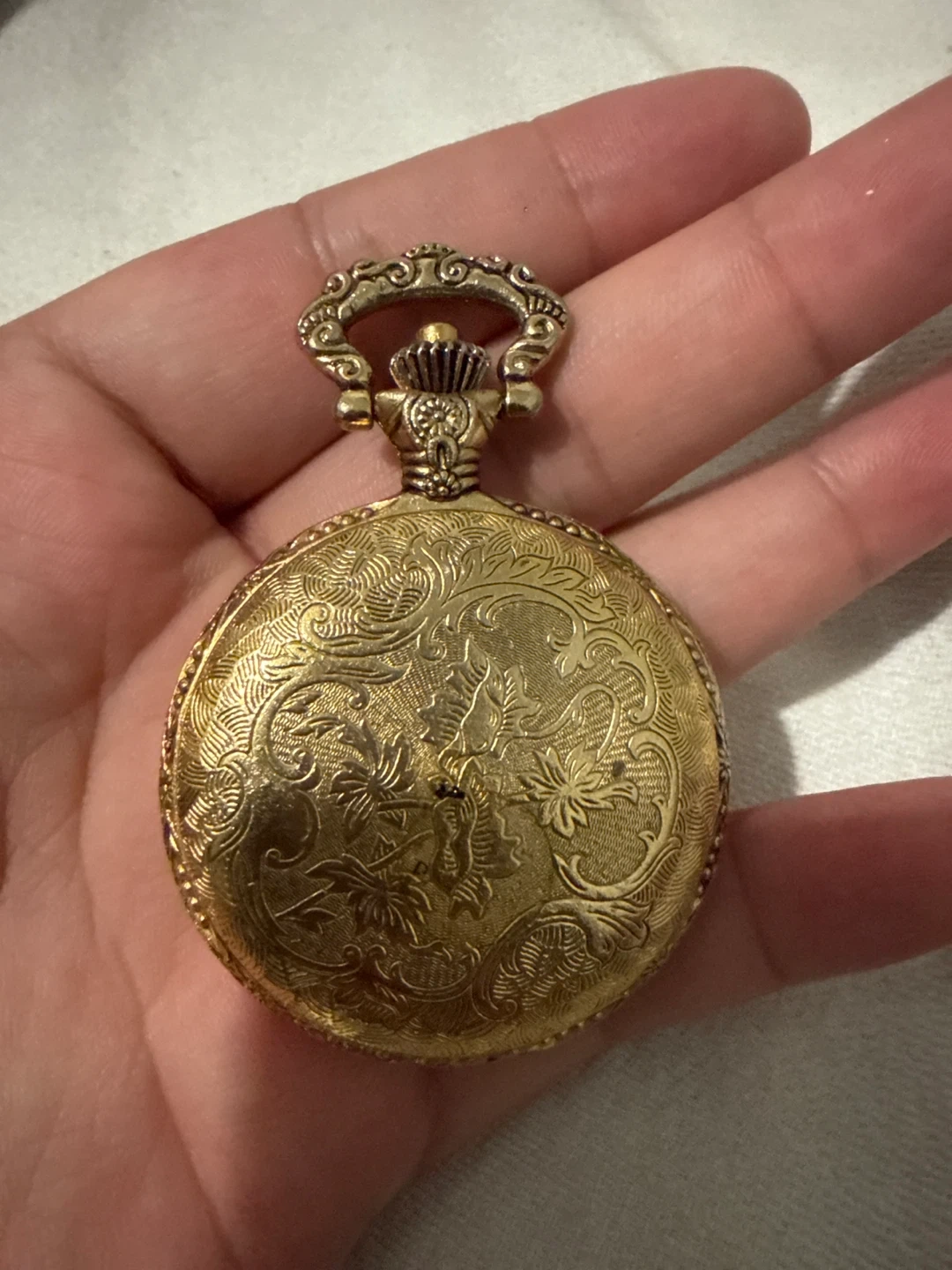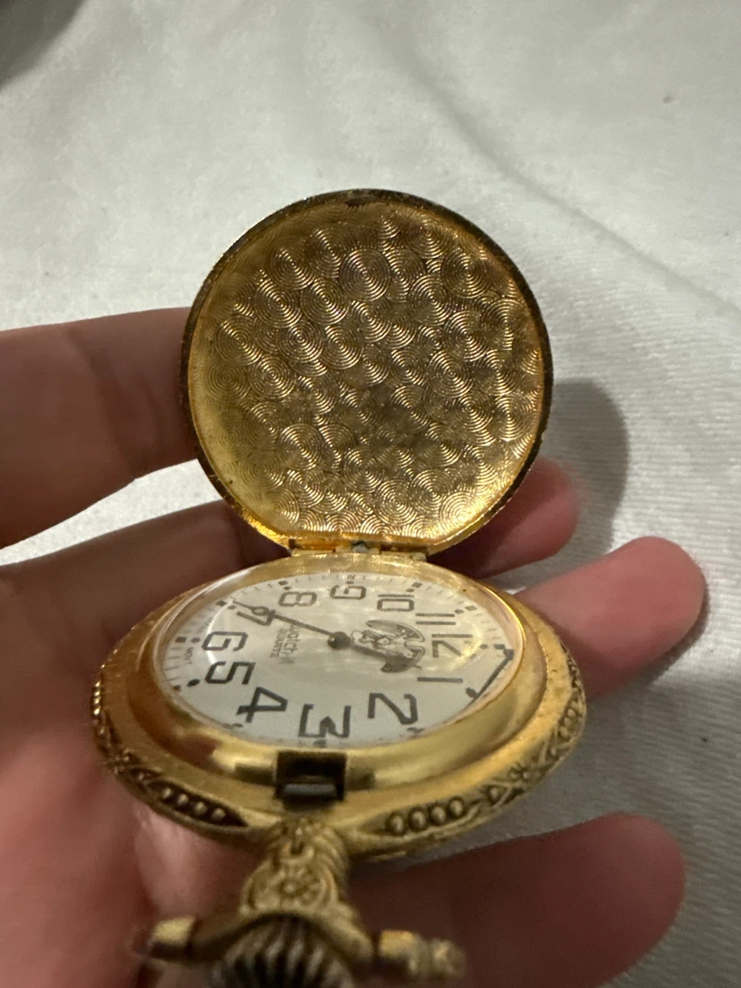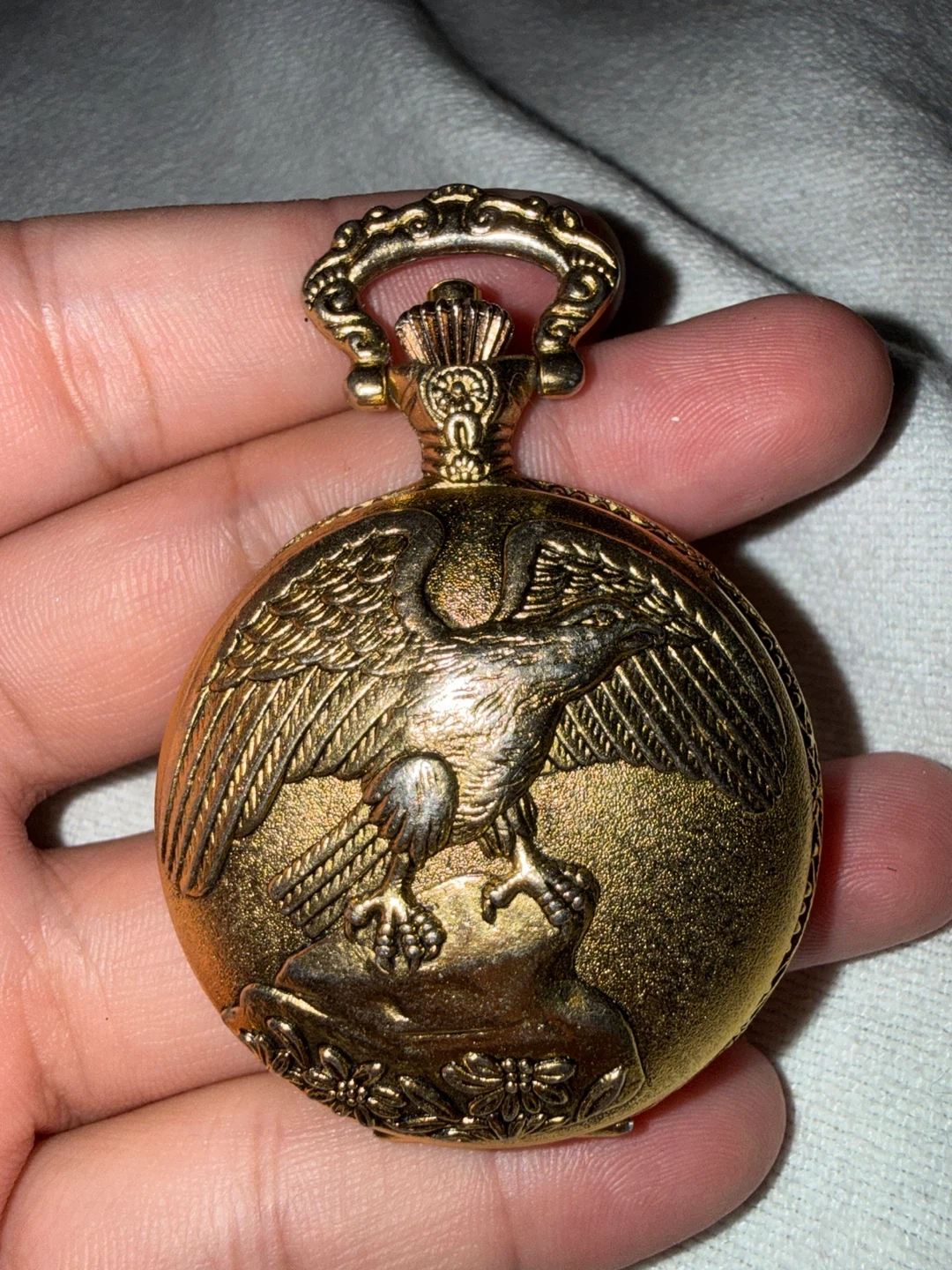 Gold tone pocket watch with an eagle design on the front. It's a quartz watch with a white face and black numerals. The inside lid has a textured pattern.