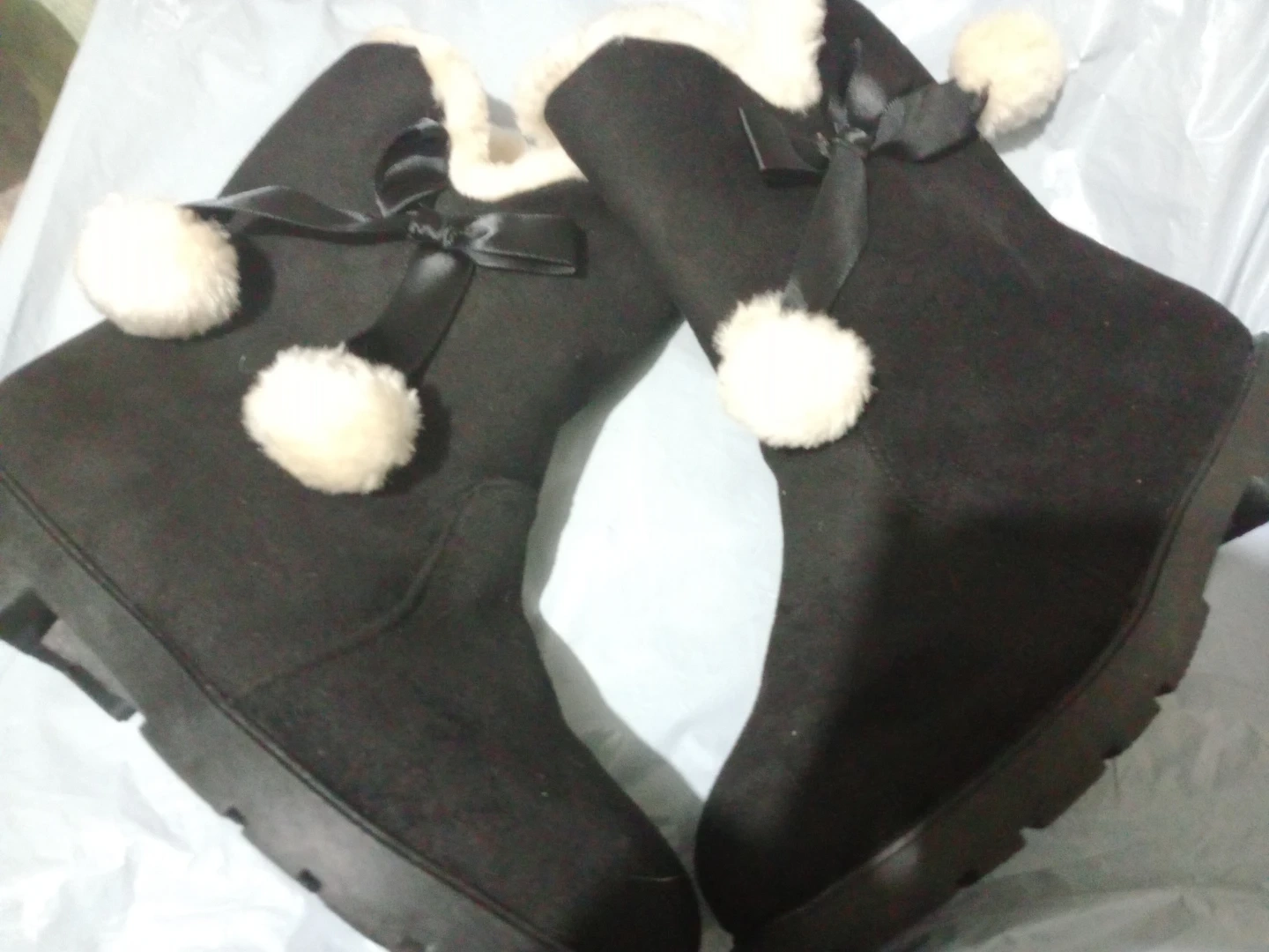 Cozy black boots featuring fluffy white pom-poms and black ribbon accents. The lining is a soft, cream-colored faux fur. These boots have a sturdy, platform-style sole. They're perfect for keeping your feet warm on chilly days! Size 34 EU.