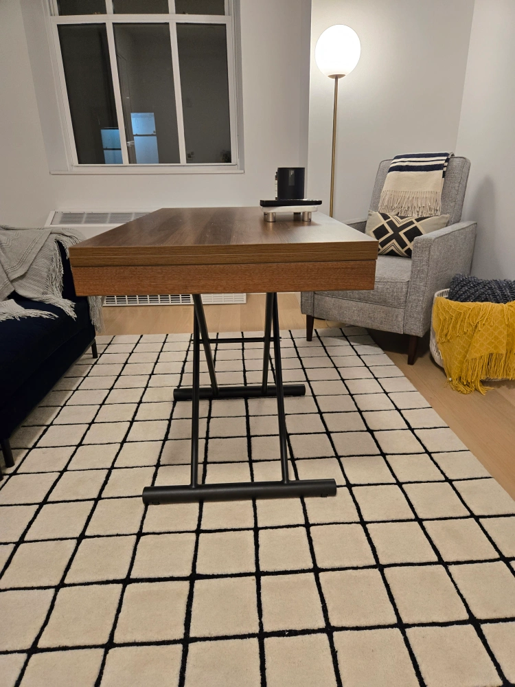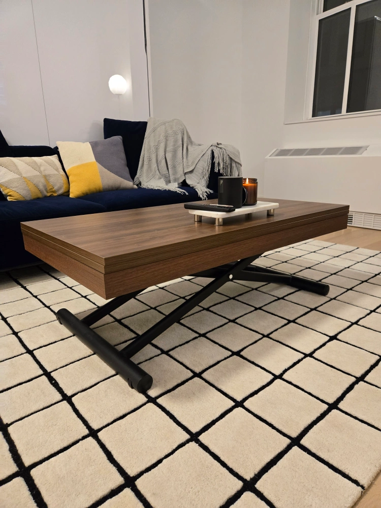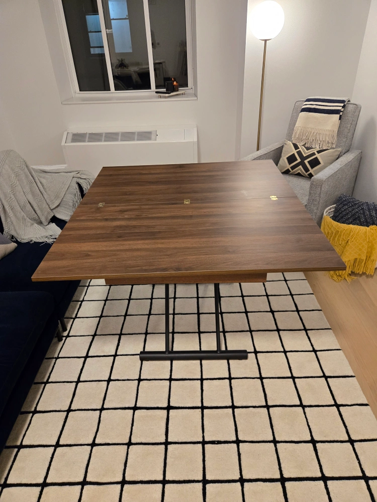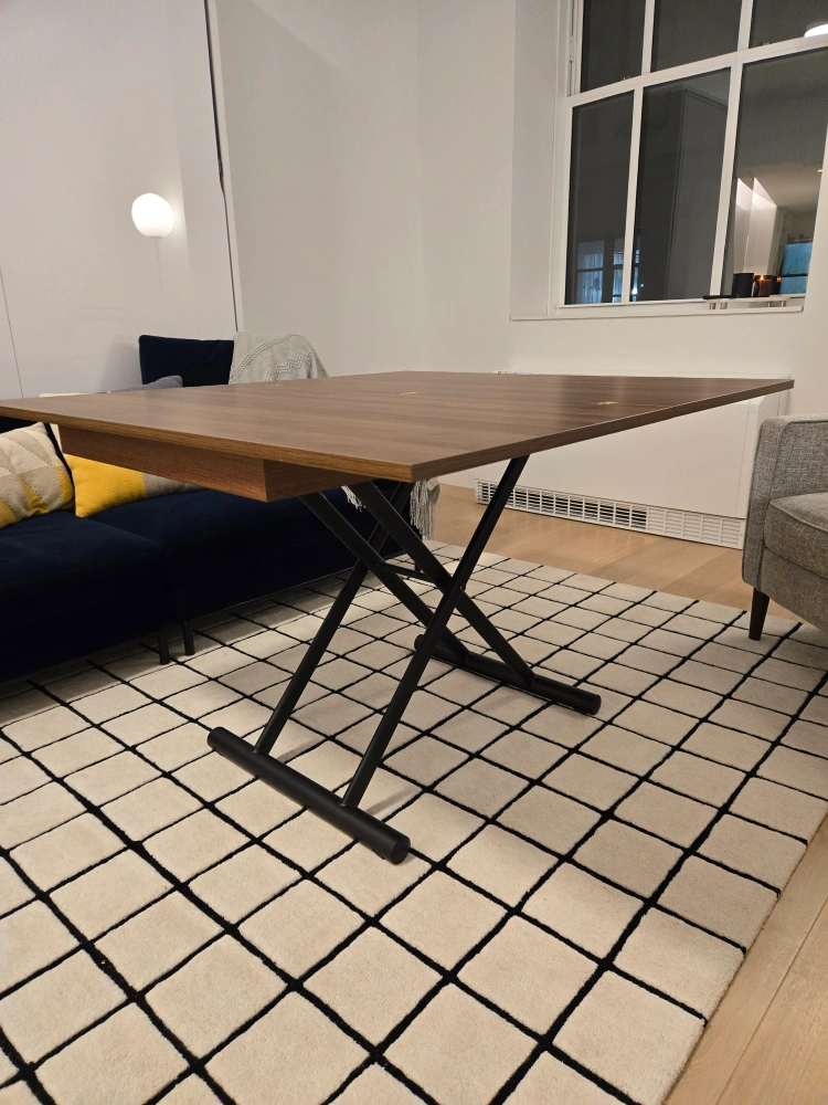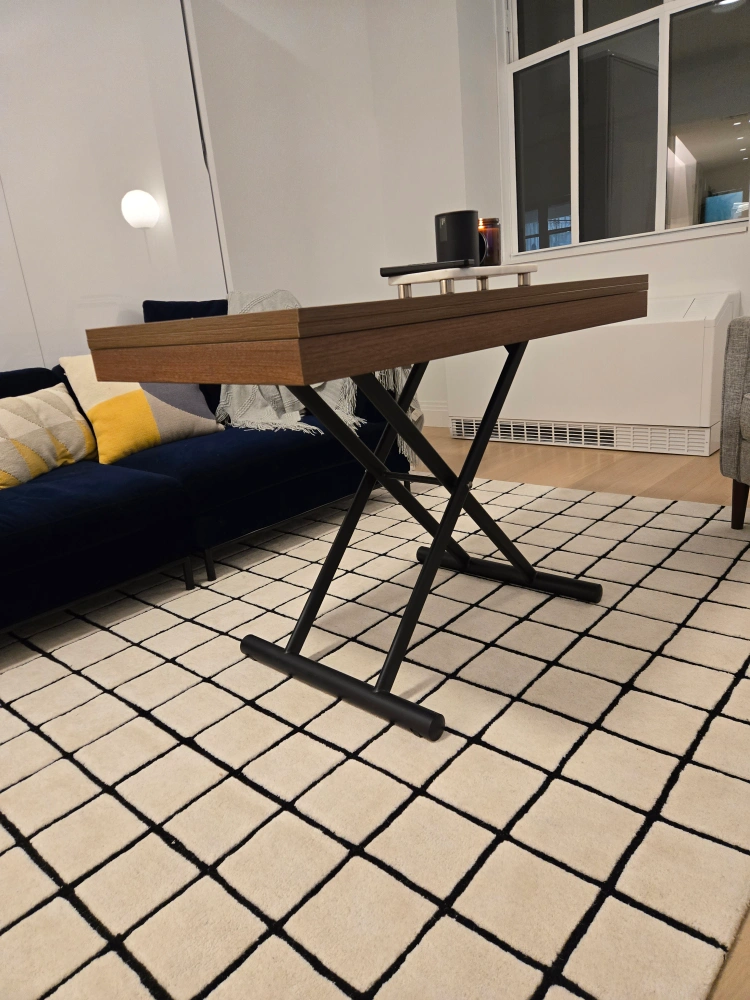 The Alzare is a small transforming coffee to dining table that utilizes a hydraulic gas lift system for strong support and easy use. With its low profile build it rests at 10 inches in height and raises all the way to a 30 inch dinner height or anywhere in between. Just activate the mechanism with a simple pull, move it to the height you like and let go and it will stay in place. Capable of holding well over 200 lbs of weight this small table also is mobile with discreet wheels built into the sleek metal bar legs. Finished in a variety of stunning table tops this is one well built space saver. Dining set bundle option here. Seats 6-8.