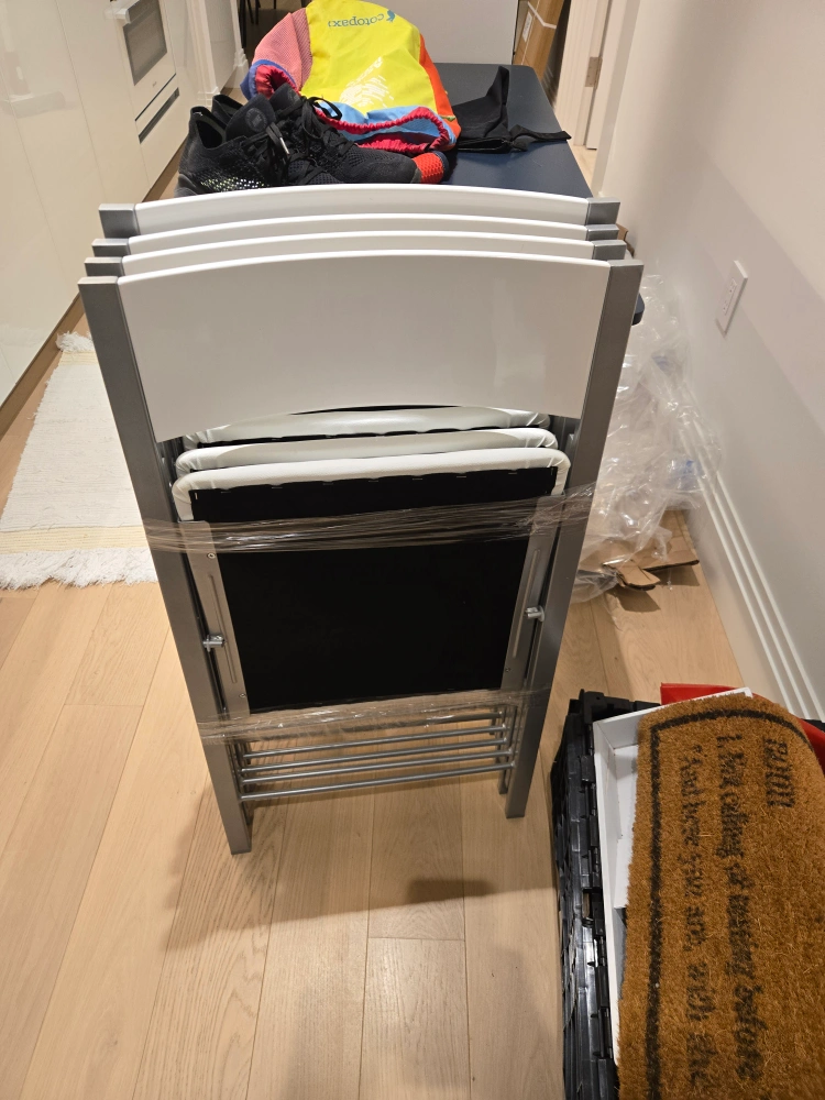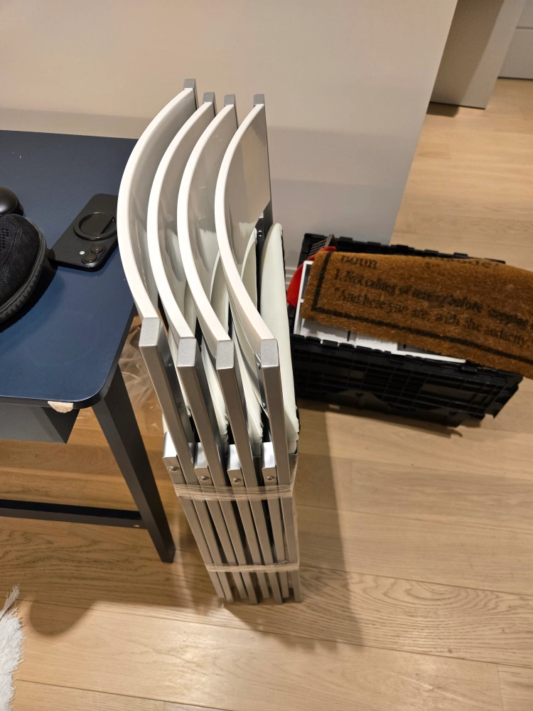 Includes 4 cushion white chairs. Ultra compact, this razor-thin Nano Folding Chair oozes style while still providing a sturdy, soft-padded and comfortable seat. Quality separates this chair from the pack; built with wood and steel for durability and strength.