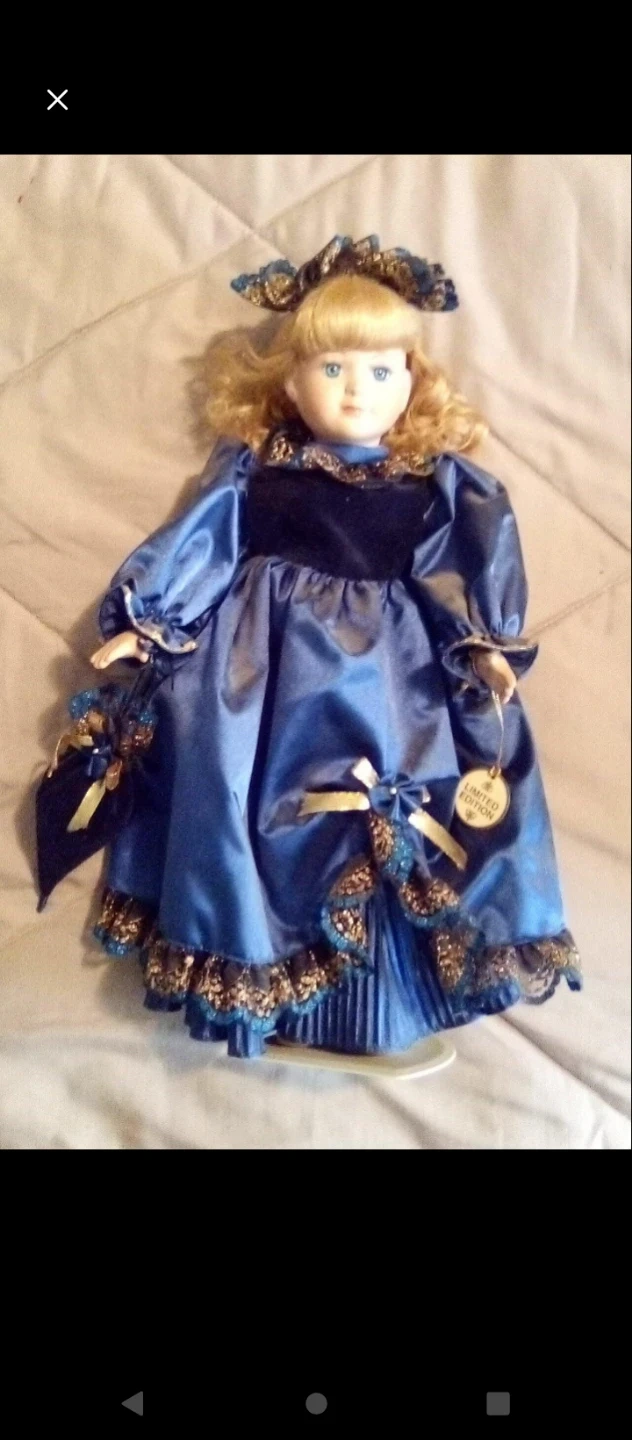 This is a beautiful limited edition porcelain doll. She's wearing a blue dress with gold trim and comes with a matching hat, purse, and umbrella. She is in good condition!