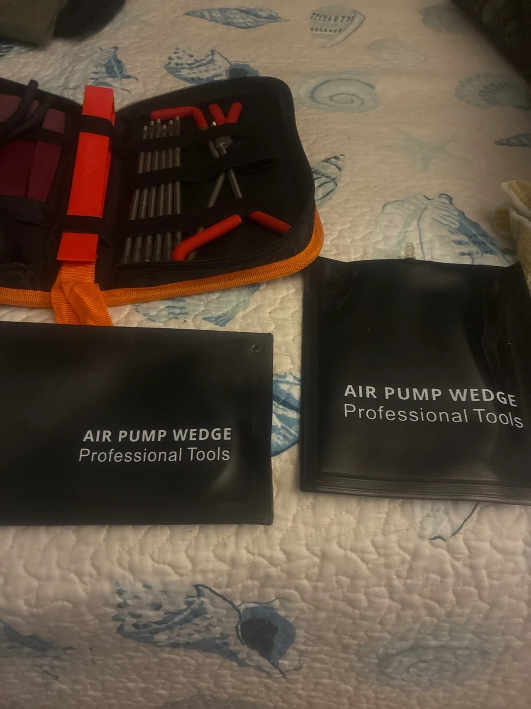 Selling a CODGEO Air Pump Wedge Professional Tools set. It comes in a convenient carrying case to keep everything organized and protected. Also included are a pair of gloves!