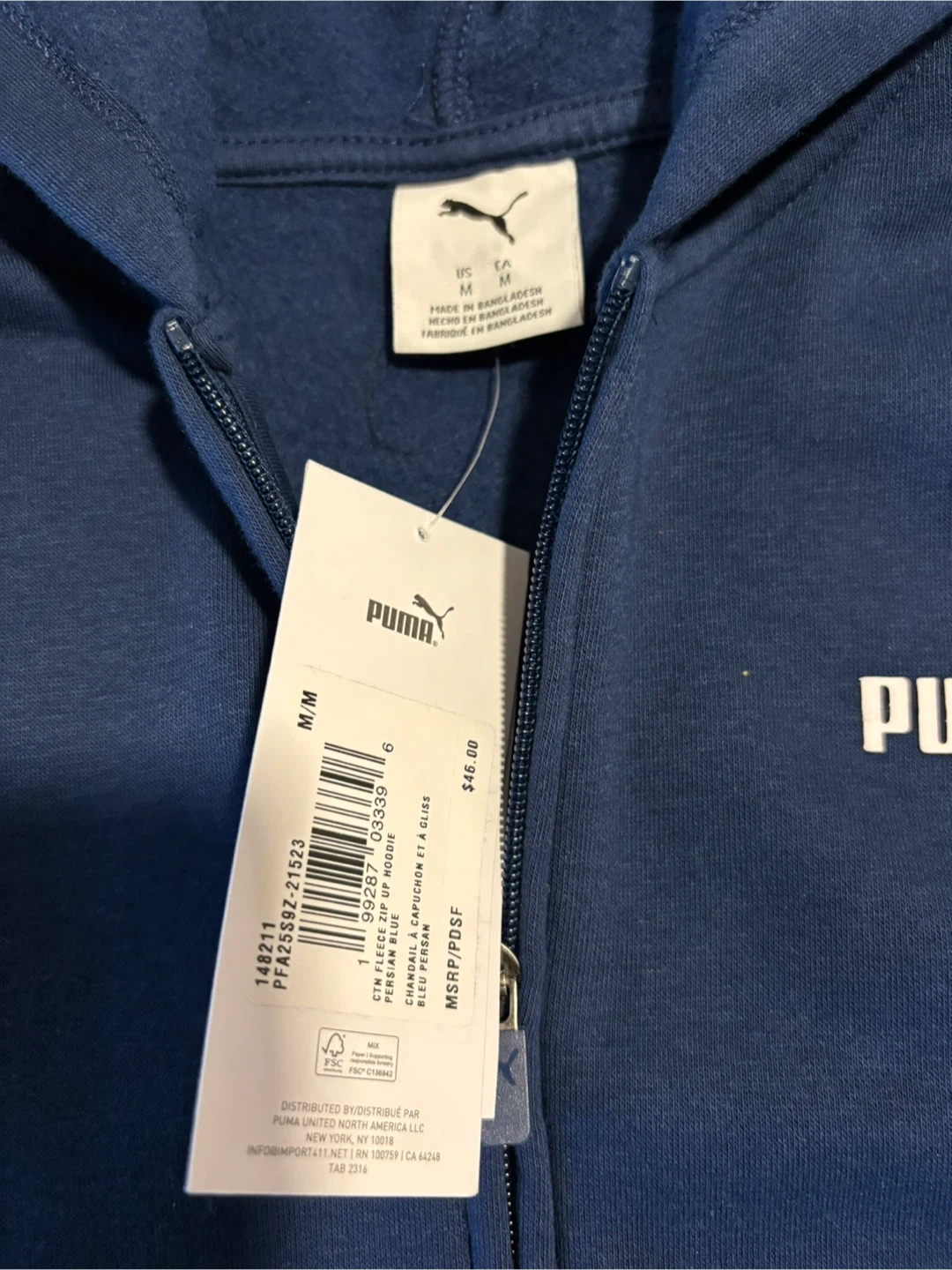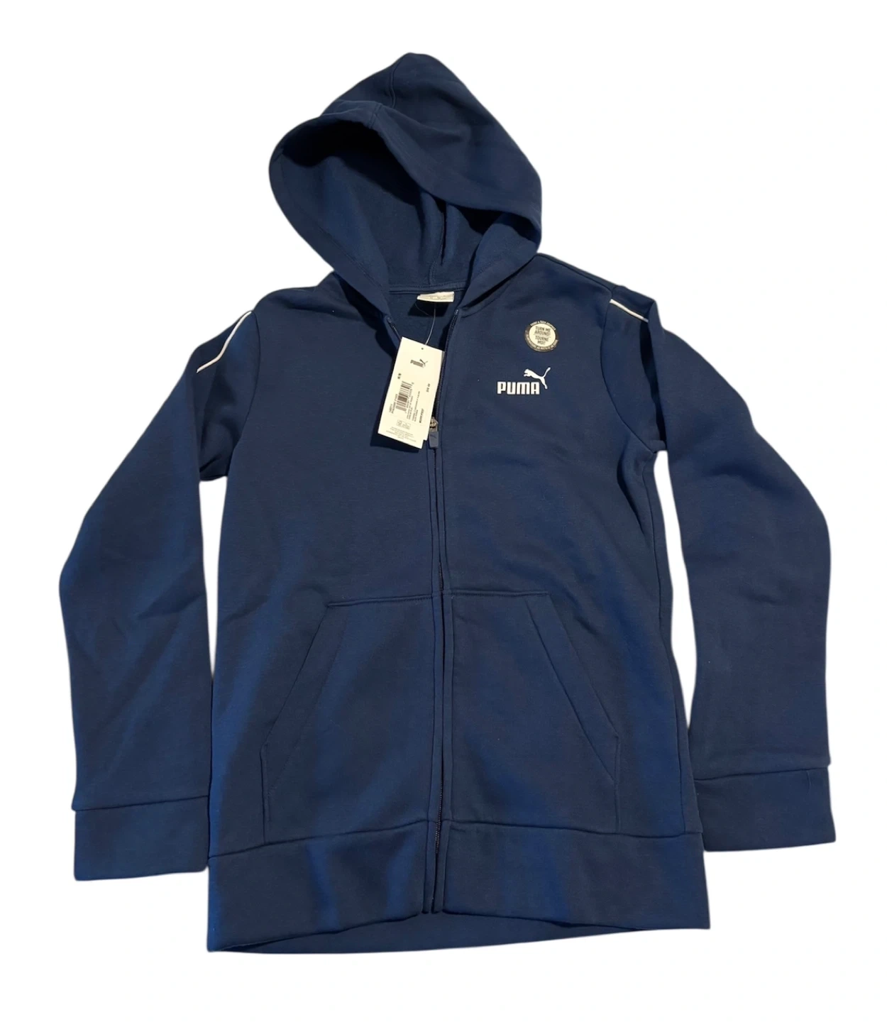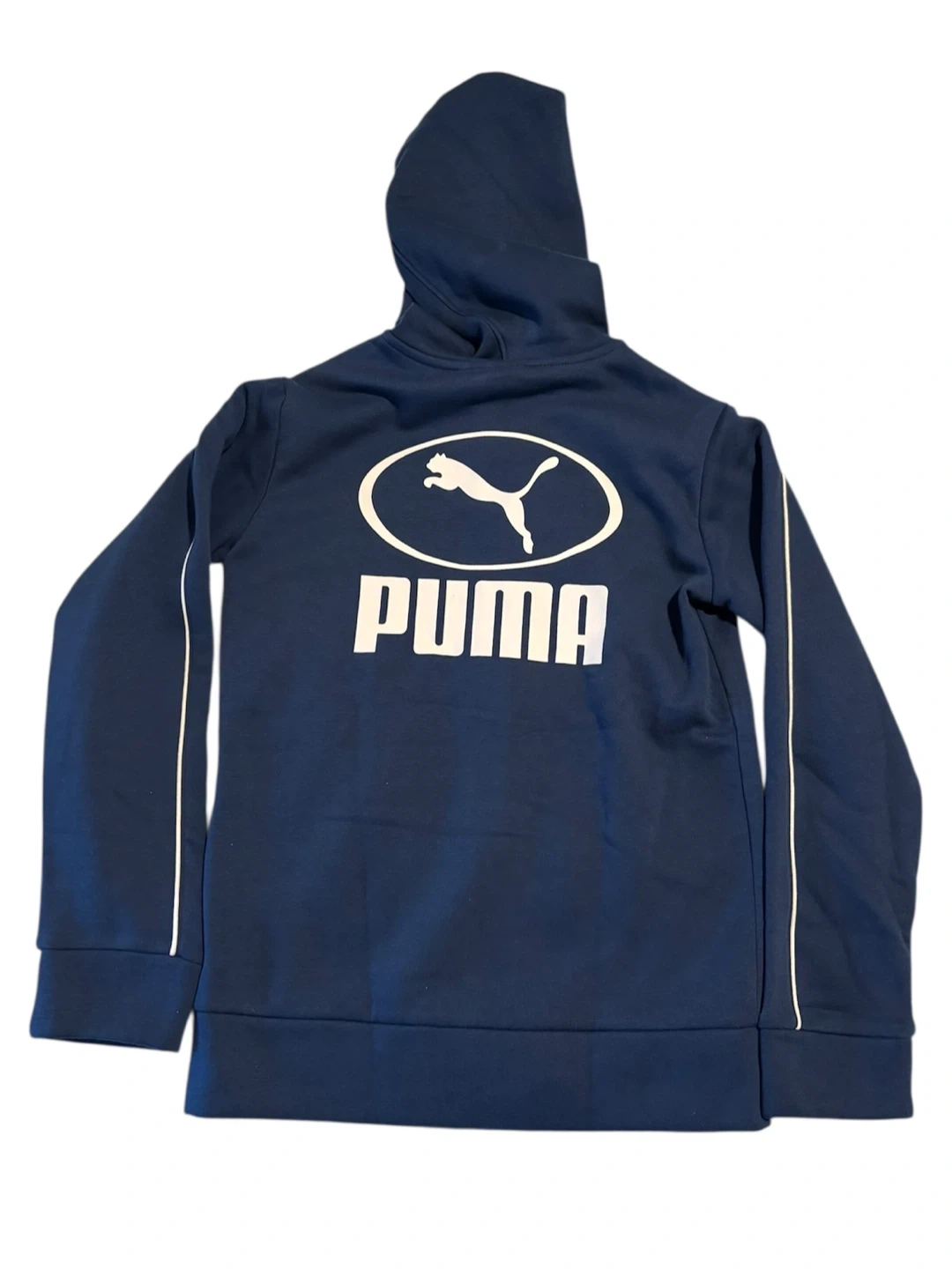 This is a Puma full zip-up hoodie jacket in blue. It's a size M, Youth. Features white piping along the sleeves and a Puma logo on the chest and back.