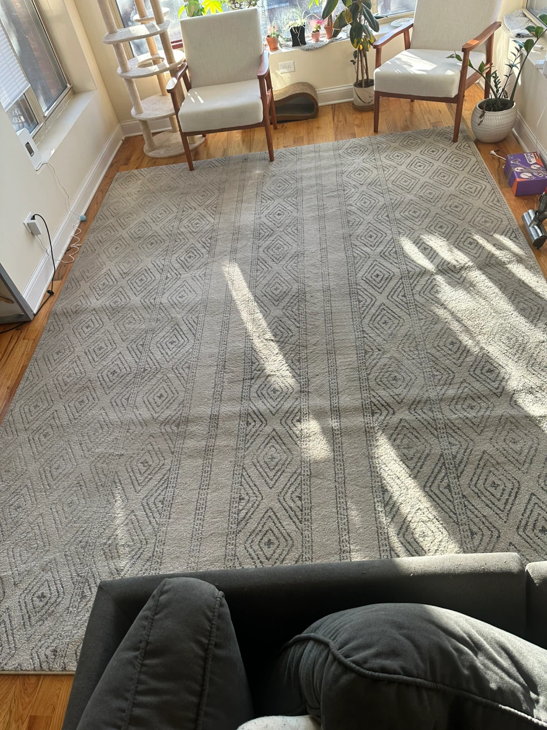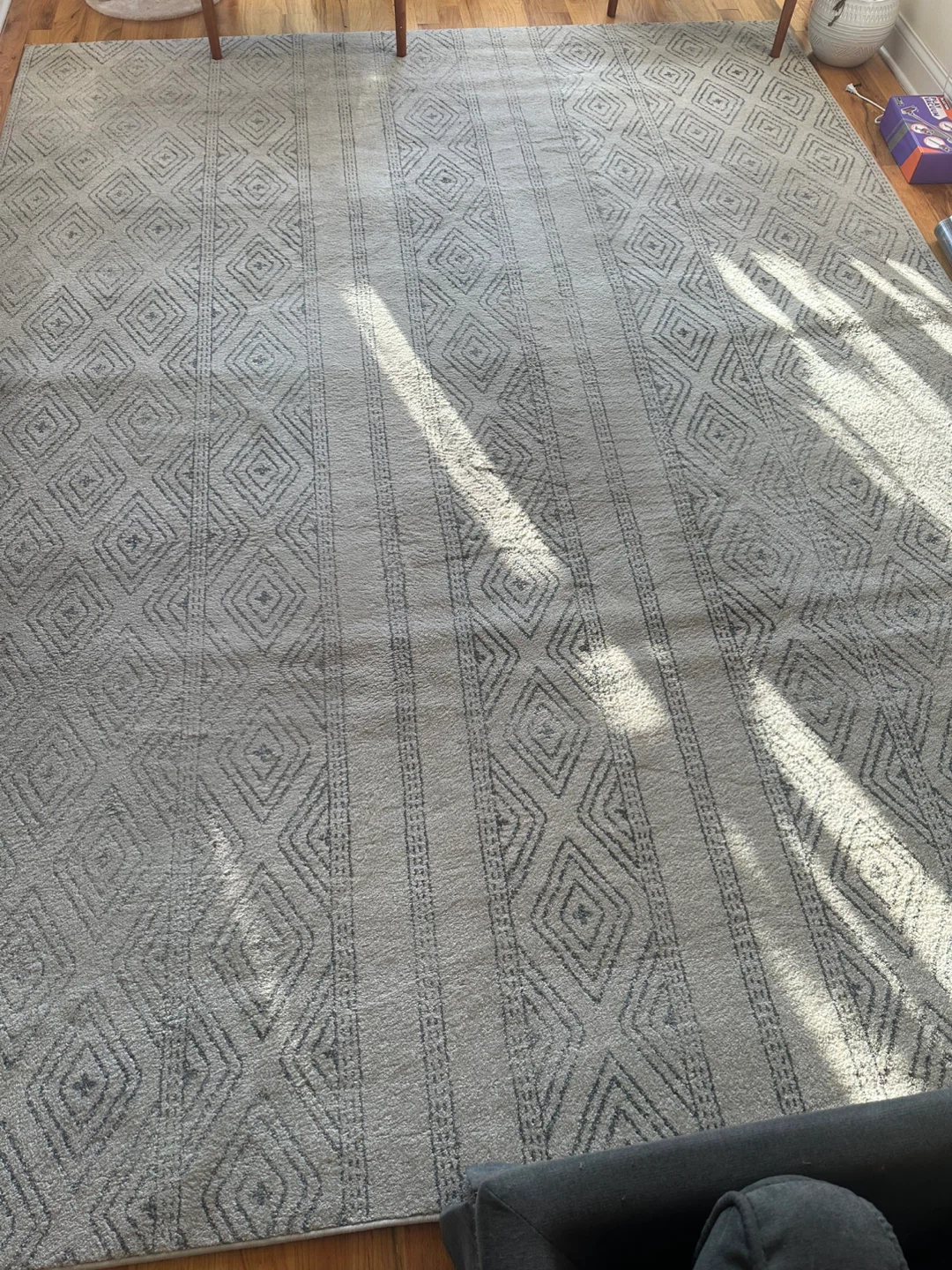A large area rug with a geometric pattern in gray and cream tones. It's well-suited for a living room or bedroom. The rug's dimensions are generous for covering a significant floor space.