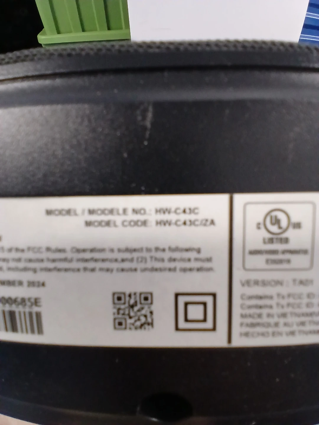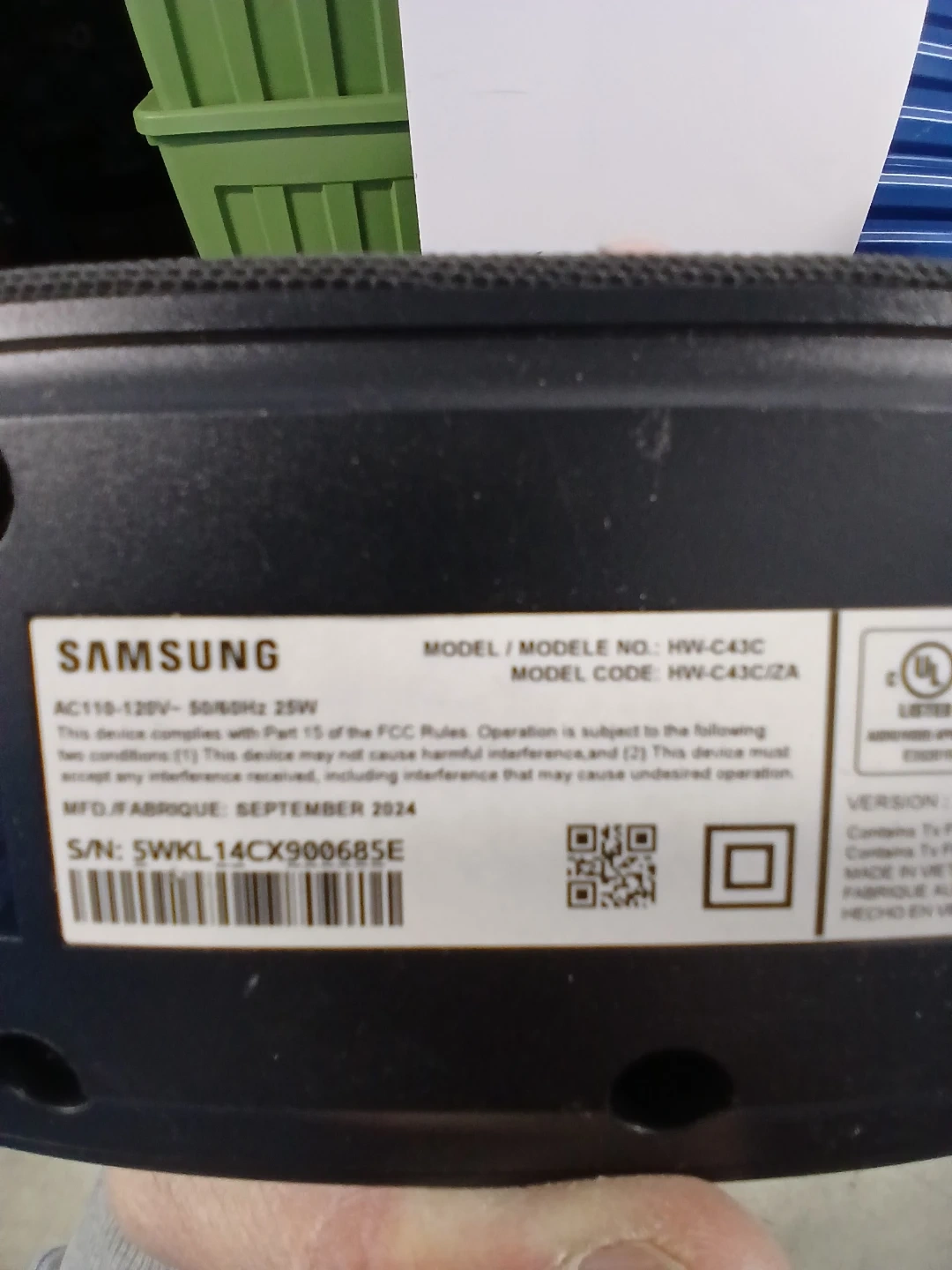 Samsung soundbar featuring Dolby Audio and DTS Virtual:X 2.0 Channel. Includes power cord. This soundbar provides enhanced audio for your home entertainment setup.