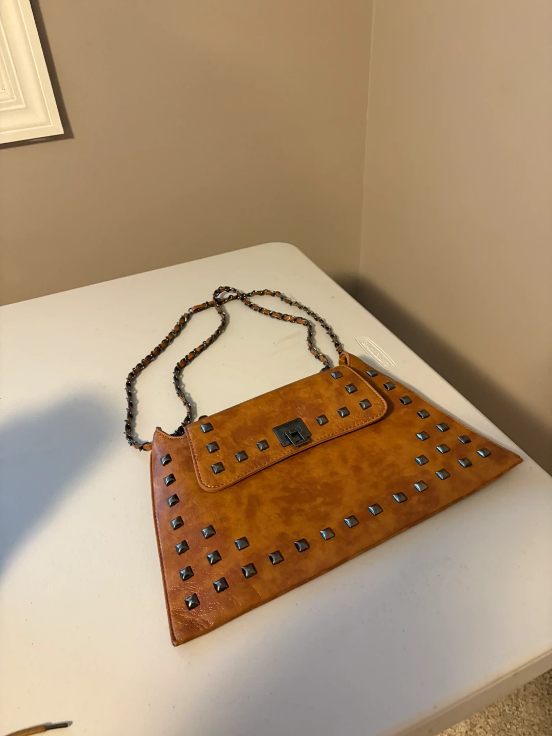 Stylish brown shoulder bag with studded detailing and a chain strap. It's in great condition and ready for a new owner!